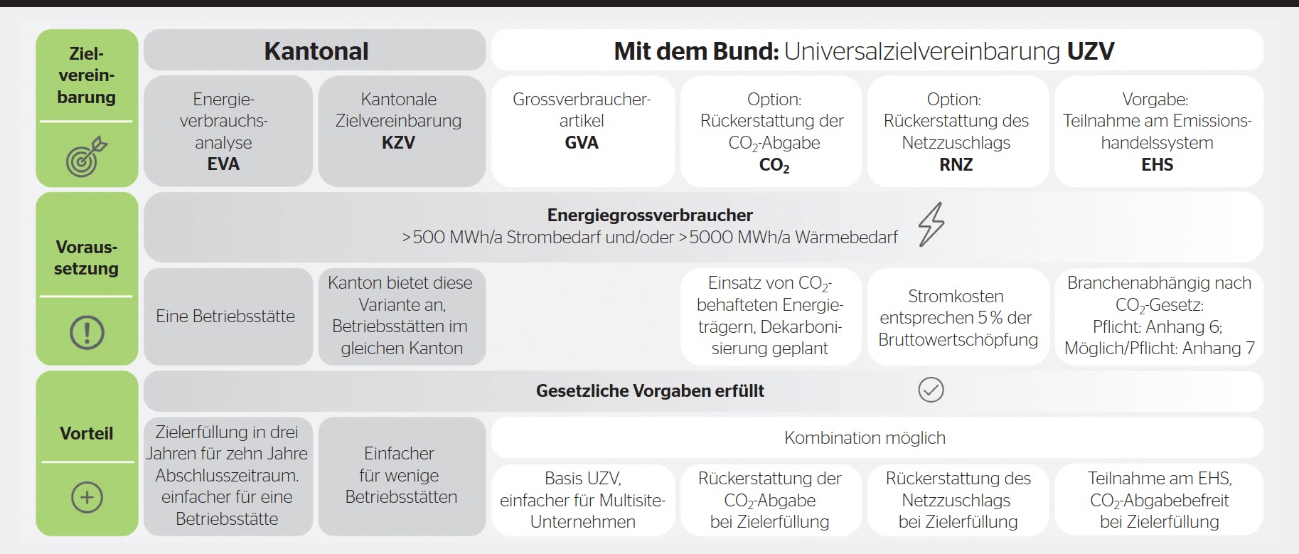 Eine kantonale Zielvereinbarung erfüllt die gesetzlichen Anforderungen, wobei die Universalzielvereinbarung (UZV) mit dem Bund zusätzliche Optionen bietet oder sogar verpflichtend sein kann. Die Teilnahme am Emissionshandelssystem (EHS) ist Pflicht, wenn das Unternehmen eine Tätigkeit ausübt, die im CO2-Gesetz entsprechend aufgeführt wird. Liegt der Fokus des Unternehmens bei der Dekarbonisierung, ist eine ZV mit Rückerstattung der CO2-Abgabe möglich. Bei stromintensiven Prozessen ist die ZV mit Rückerstattung des Netzzuschlags interessant.