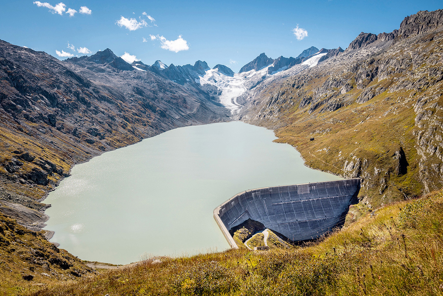 Zur Veranschaulichung der Zusammenhänge bei der Wasserbewirtschaftung ist in Bild 1 ein Ausschnitt aus dem Anlagenschema der Kraftwerke Oberhasli mit den Jahreswerten 2022 für die Energie- und Wassermengen dargestellt. Die Pumpen haben 500 Mio. m³ Wasser vom Grimselsee in den Oberaarsee gefördert. Allerdings haben die Turbinen im gleichen Zeitraum nur 478 Mio. m³ verarbeitet. Ein Teil der gepumpten Wassermenge, wie auch die natürlichen Zuflüsse, wurden also über die Zentrale Grimsel 1 (79 Mio. m³) turbiniert. Berücksichtigt man, dass Ende 2022 der Oberaarsee 4 Mio. m³ mehr Speicherinhalt als am Anfang hatte, müssen in diesem Jahr 61 Mio. m³ Wasser natürlich in den See geflossen sein. Eine nähere Auswertung mit den Niederschlags- und Temperaturwerten im Einzugsgebiet des Oberaarsees zeigt, dass dabei rund die Hälfte der Zuflüsse aus dem abschmelzenden Oberaargletscher stammen muss.