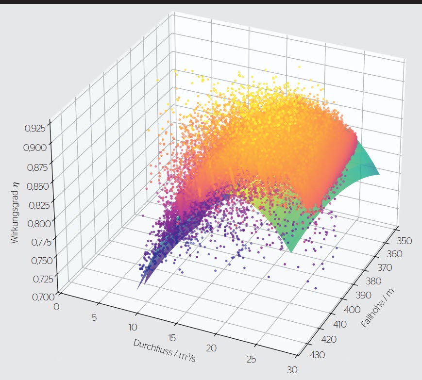 Die Effizienz einer Turbine im Betrieb wird vom Durchfluss und der Nettofallhöhe bestimmt. Da im KIDS Durchfluss, hydraulischer Druck und elektrische Leistung gespeichert werden, können Wirkungsgrade jeder Turbine oder Pumpe aus den Messdaten für alle im Betrieb aufgetretenen Arbeitspunkte berechnet werden. In Bild 2 sind Wirkungsgradwerte für die Arbeitspunkte von Turbine 2 im Zeitraum 2022 – 2024 dargestellt. Die Grenzen der Genauigkeit von Datenerhebung und Datenanalyse werden durch die wolkenförmige Verteilung der einzelnen Punkte sichtbar.