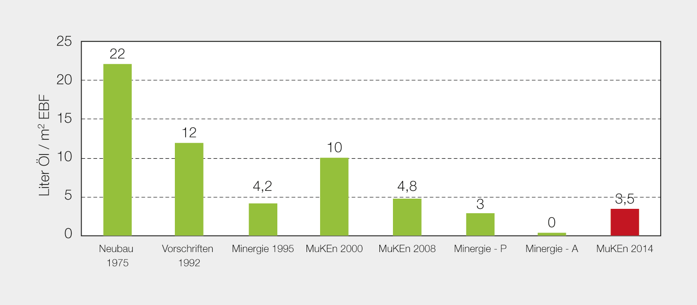 Ab 2020 sollten nur noch Neubauten erstellt werden, die die Anforderungen eines NZEB erfüllen, dem möglichst wenig Energie zugeführt werden muss. Für die Heizung, Warmwasser, Kühlung und Lüftung dürfen maximal jährlich 35 kWh/m2 aufgewendet werden (Bild 1). Der neue Standard der Muken 2014 bewegt sich zwischen dem Minergie- und Minergie-P-Standard resp. zwischen 90 % und 60 % des gesetzlich zulässigen Wärmebedarfs. Basis ist die Norm SIA 380/1 2009.