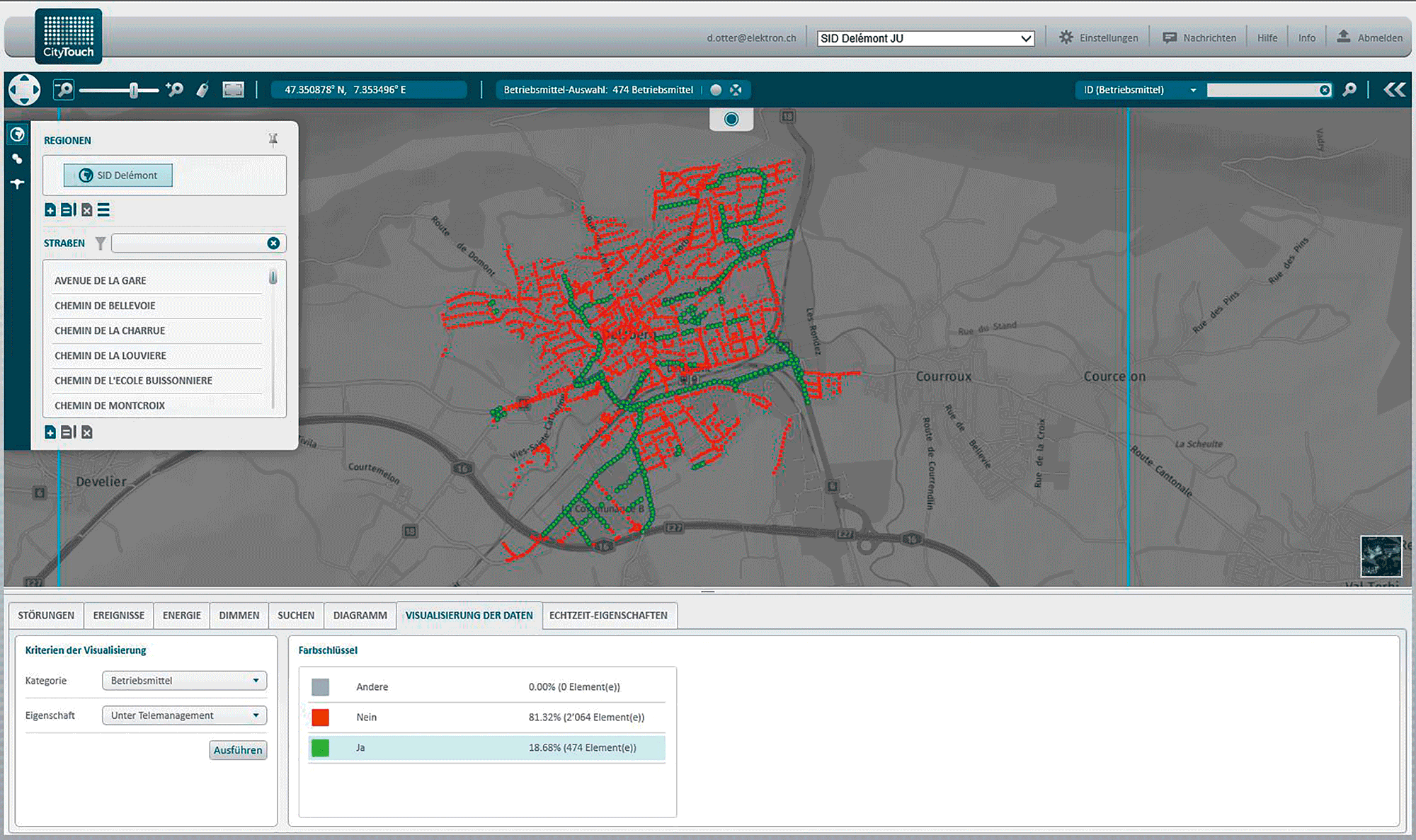 Die Implementierung eines Lichtmanagementsystems setzt die Zusammenführung aller Bestandsdaten in der Software voraus. Einzelne Lichtpunktinformationen können durch die offenen Schnittstellen der Software aus unterschiedlichen Quellen wie einem bestehenden GIS-System, einer SQL-Datenbank oder einem Excel-Dokument importiert werden. In der Regel sind Grundinformationen, wie die Geo-Koordinaten, Kandelabernummer, Lichtpunkthöhe und Leuchtentyp bereits in einer Datenbank digital vorhanden. Zusätzliche Daten, wie Einspeisepunkt (Verteilkabine), Absicherung (Sicherungselement), Leuchten-Controller sowie Detailinformationen zu Mast- und Leuchtentyp werden von Betreibern oft in einer separaten Excel-Liste gepflegt. Die Ausgangslage in Delémont war dank der umfassenden Datenbasis optimal. Bei der Umstellung auf CityTouch konnten die bereits vorhandenen, umfangreichen Lichtpunktinformationen auf einfache Weise integriert werden.