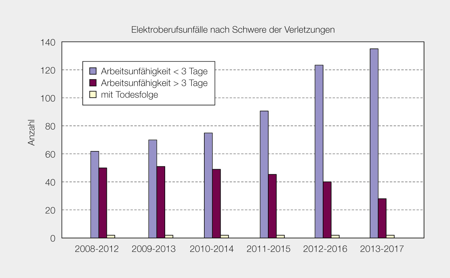 Während der Anteil der Unfälle im Niederspannungsbereich kontinuierlich gestiegen ist, hat sich der Anteil der Unfälle im Hochspannungsbereich weiter auf einem relativ tiefen Niveau stabilisiert. Die Unfälle geschehen hauptsächlich bei Arbeiten an Erzeugungs- und Verteilanlagen, bei den Niederspannungs-Installationen und bei den Verbrauchern. Zu beobachten ist ein überdurchschnittlicher Anstieg der Unfälle in den Altersgruppen unter 40 Jahren. Die Mehrheit der Verunfallten ist ungelernt oder noch in der Ausbildung. Bei den Auswirkungen ist der Anteil der Unfälle mit Durchströmung steigend, während der Anteil der Unfälle durch Störlichtbogen leicht rückläufig ist.
