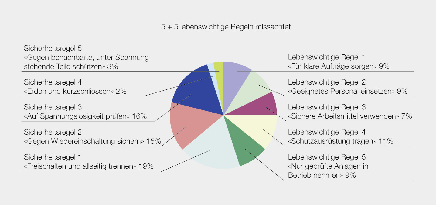 In Berufsumfeld ist Nulltoleranz bei der Anwendung der 5+5 lebenswichtigen Regeln im Umgang mit Elektrizität notwendig. Sowohl Vorgesetzte als auch Mitarbeitende sind für ihre Umsetzung verantwortlich. Sie müssen Stopp sagen, wenn nicht nach diesen Regeln gearbeitet werden kann. Das Leben einer Person, wegen Zeitdruck aufs Spiel zu setzen, lohnt sich nicht.