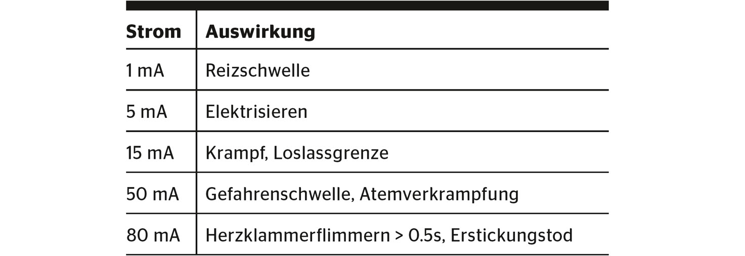 Die Auswirkungen von Elektrounfällen sind Durchströmung, Störlichtbogen bzw. Folgeunfällen. Welche Auswirkungen auftreten, sind oft zufällig und hängen davon ab, wo sich der Verunfallte gerade befindet. Die Auswirkungen einer Durchströmung sind in der Tabelle 1 dargestellt. Ein Störlichtbogen mit Temperaturen von über 5000°C kann sehr schmerzhafte Verbrennungen 2. bis 3. Grades verursachen. Zudem können Störlichtbogen und Durchströmungen zu Stürzen und Wegschleudern führen, mit schweren Folgeverletzungen.