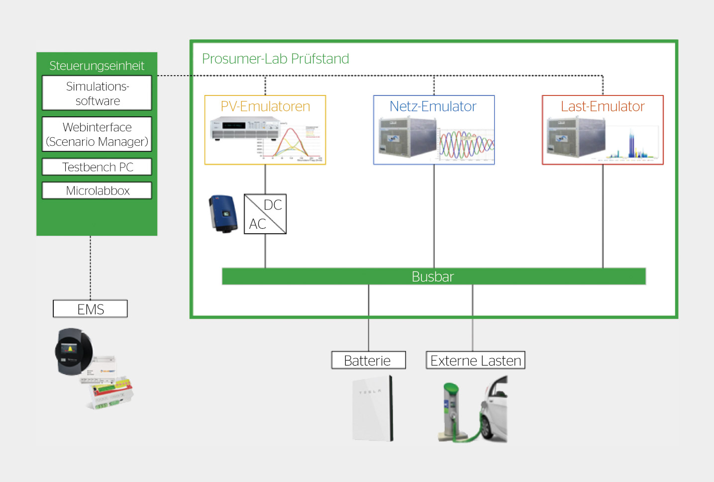 Mit dem Pilot- und Demonstrationsprojekt lassen sich unterschiedliche Zustände oder Situationen eines Haushalts, die sonst nur schwer zu reproduzieren wären, mit zuvor erstellten Profilen (Verbrauch-, Wetter-, Temperaturprofile etc.) realitätsnah simulieren. Der Prüfstand funktioniert über eine Kombination aus Emulation und Simulation, um die elektrischen Energieflüsse eines Haushalts mit Photovoltaik, Wärmepumpe und Batteriespeicher bis zum Netzanschlusspunkt mit echten Spannungen und Strömen nachzubilden. Das ist nötig, um Systemkomponenten wie Energiemanagementsysteme, Wechselrichter oder Batteriespeicher unter kontrollierten Bedingungen zu entwickeln, zu vergleichen und zu testen. Dank ihrem modularen Aufbau eignet sich die Testplattform zur Erprobung aller Arten von Energiemanagementsystemen und Systemkomponenten für Privathaushalte wie Batterien, Wechselrichter etc. Die Entwicklung und der Vergleich von Systemen erfolgen dabei auf der Grundlage identischer Profile respektive Bedingungen über eine ganze Testreihe.