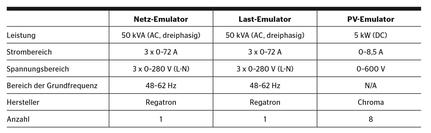 Der Prüfstand des Prosumer-Labs lässt sich in drei Hauptbereiche unterteilen (Bild 1). Der Netz-Emulator erzeugt eine dreiphasige, sinusförmige Spannung mit variabler Frequenz und Amplitude bis 50 kVA Leistung. Er bildet das Stromnetz am Anschlusspunkt des emulierten Haushalts nach. Diesem Signal lassen sich Oberschwingungen hinzufügen und es können transiente Ereignisse wie zum Beispiel Überspannungen erzeugt werden. Ein Last-Emulator emuliert eine dreiphasige Last mit einem konfigurierbaren Leistungsfaktor. Es sind drei unterschiedliche Betriebsarten möglich: Konstante Wirkleistung (CP), konstante Impedanz (CZ) oder konstanter Strom (CI). Jede Phase wird einzeln gesteuert, wodurch asymmetrische Lasten generiert werden können. Acht Photovoltaik-Emulatoren mit je 5 kW Leistung ermöglichen, Anlagen mit unterschiedlicher Dachausrichtung nachzubilden – zum Beispiel ein Solarkraftwerk auf zwei Dachschrägen und an Hauswänden.