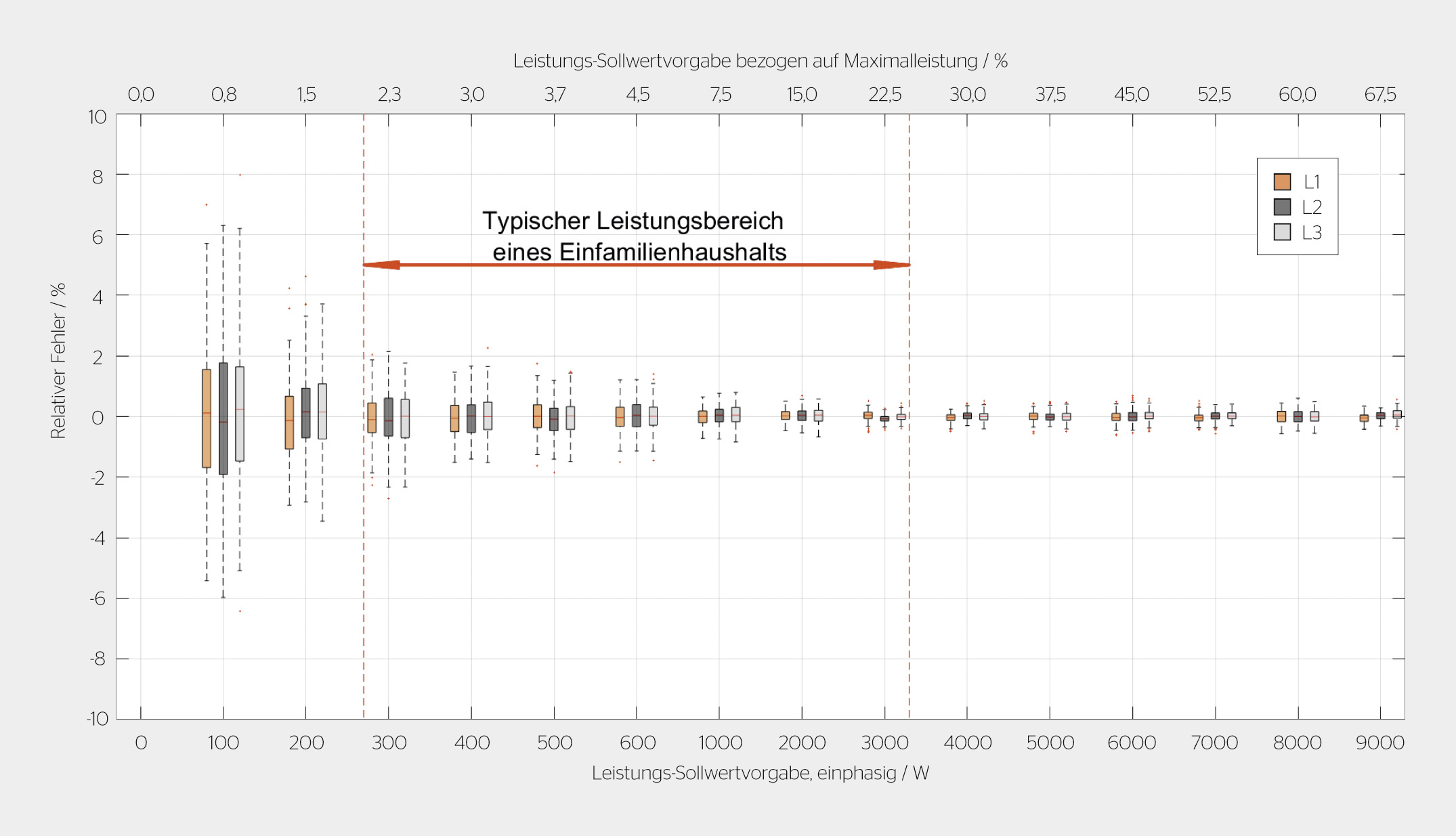 Der relative Fehler zwischen dem Leistungssollwert und der Messung nimmt mit steigendem Arbeitspunkt allmählich ab (Bild 2). Bei einer einphasigen Last reduziert sich der Fehler von maximal 6% (bei 100 W) auf unter 1% (ab 1 kW). Bild 2 zeigt, dass unterhalb von 1 kW der maximale absolute Fehler nicht mehr als 10 W beträgt. Über den gesamten Leistungsbereich weist der Last-Emulator eine hohe Genauigkeit bei der Sollwertumsetzung auf – insbesondere im Leistungsbereich eines Einfamilienhaushalts, dem typischen Einsatzbereich.