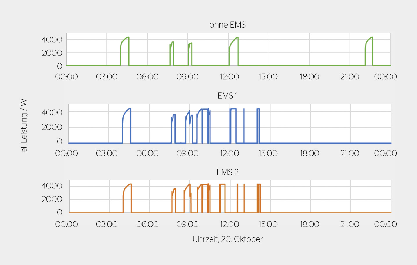 Bild 4 zeigt den Leistungsverbrauch der Wärmepumpe bei unterschiedlichem Betriebsverhalten. Verglichen wird der Betrieb der Wärmepumpe ohne Steuerung und mit Steuerung durch zwei verschiedene EMS. Haupteinflussparameter auf das Schaltverhalten der Wärmepumpe sind die Innentemperatur des Wasserspeichers und der Leistungsüberschuss des Haushalts.