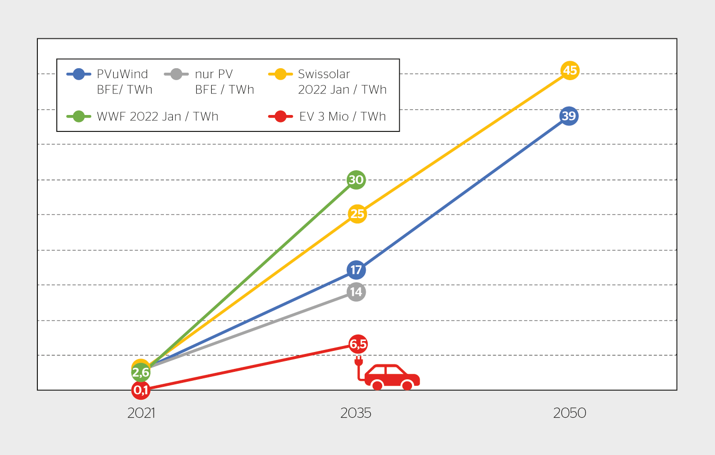 Im Jahr 2035 könnten in der Schweiz drei Millionen Elektro-PWs 7 TWh laden, also etwa einen Zehntel des heutigen Stromverbrauchs. Dabei ist der Bedarf des elektrisch betriebenen öffentlichen Verkehrs und der elektrischen Lastkraftwagen in etwa der gleichen Grössenordnung noch zu addieren. Beispielsweise wird aktuell 6 TWh Elektrizität fürs Heizen von Oktober bis April verwendet, mit einem Effizienzsteigerungspotenzial von rund 55%.[1] Gelingt es, diese Verschwendung zu beseitigen, steht dem der wachsende Strombedarf durch die Substitution der fossilen Heizungen, beispielsweise mit Wärmepumpen, entgegen. Dies zeigt erneut, wie wichtig der erwähnte Zubau der erneuerbaren Stromerzeuger in den nächsten Jahrzehnten ist.