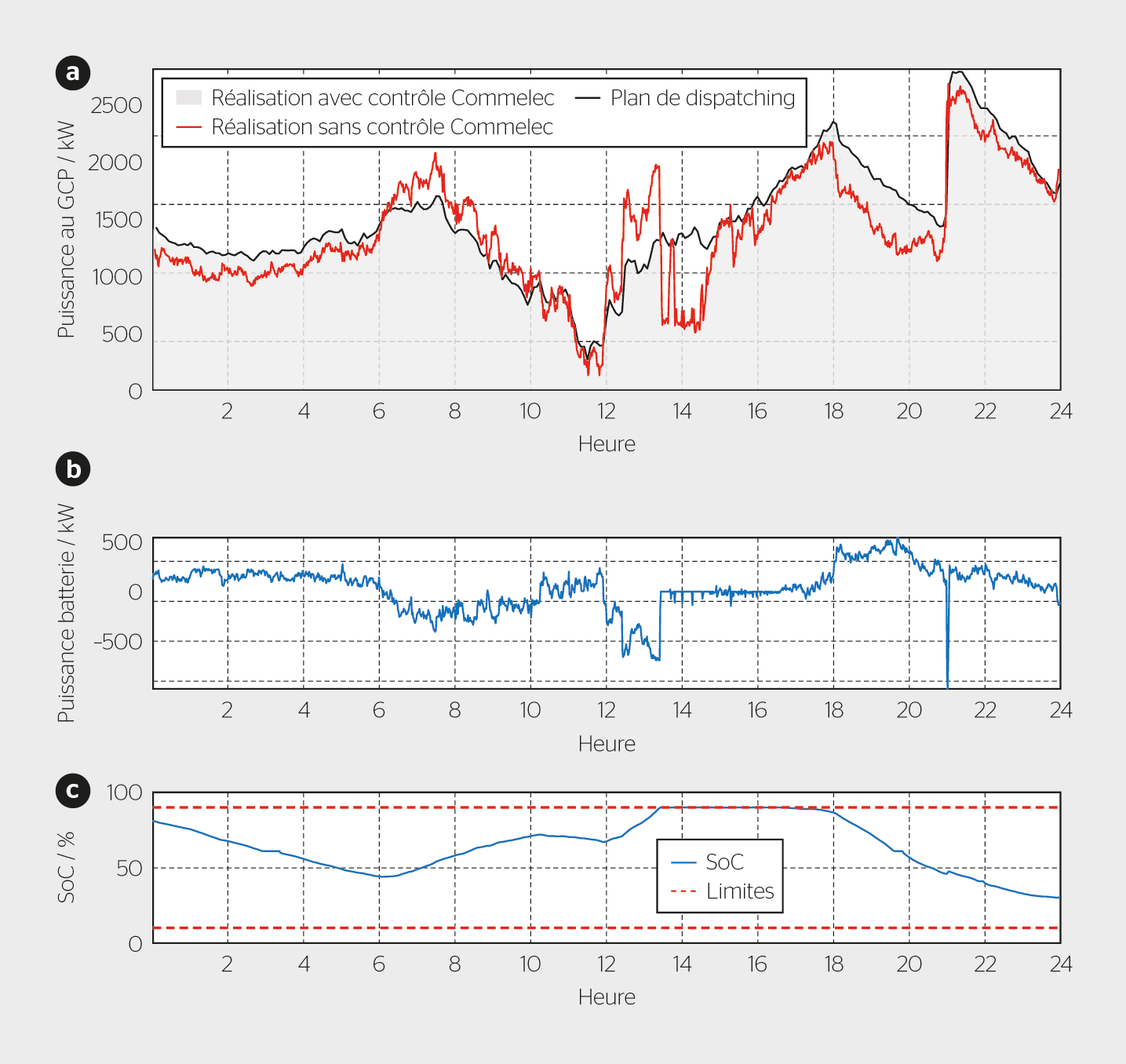 Le système Commelec a également été utilisé dans le démonstrateur d’Aigle en tant qu’alternative au MPC. Bien que la commande puisse être exécutée rapidement, en 100 ms, un cycle de calcul de 10 s a été choisi dans le cadre de cette expérience à des fins de comparaison avec le MPC. La figure 4a montre la puissance active au point de connexion au réseau (GPC ou slack node) avec ou sans application de la commande du système de stockage d’énergie par batterie, ainsi que la valeur de suivi calculée par le plan de dispatching. Le système Commelec a pu suivre de manière fiable le plan de dispatching, sauf pour la période comprise entre 14h20 et 17h40. Comme l’illustrent les figures 4b et 4c, qui présentent le calcul de la puissance active pour le système de stockage d’énergie par batterie et l’évolution respective de son état de charge (SoC), cette période correspond au moment où le niveau de charge de la batterie était saturé (une condition qui peut être évitée avec de meilleures prévisions).