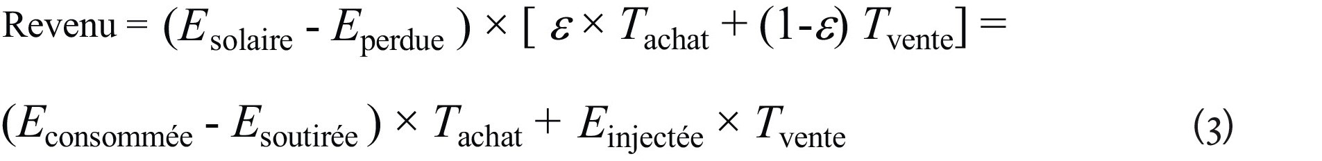 Le revenu dépend des tarifs du GRD, soit Tachat pour le courant soutiré et Tvente pour le courant injecté: