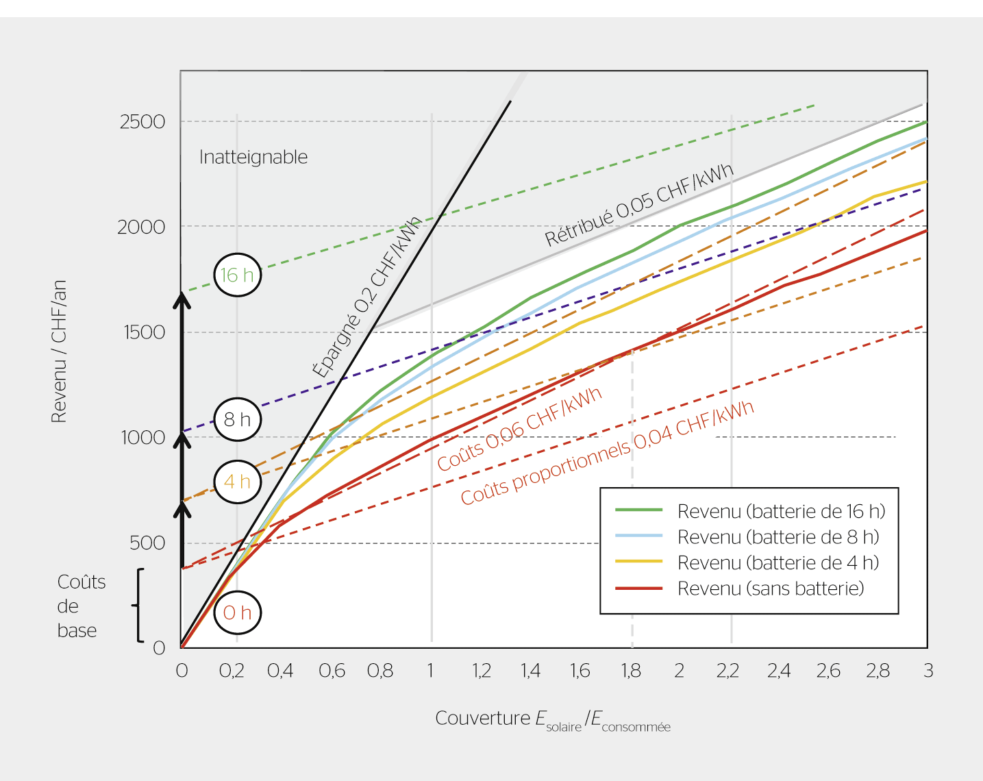 Une batterie de 4 h (courbe orange) permet de faire croître le revenu car l’autoconsommation augmente, mais la droite des coûts est décalée de 320 CHF/an (4 x 80 CHF) vers le haut et dépasse ainsi le revenu additionnel. L’installation ne sera donc pas rentable avec des coûts de 0,06 CHF/kWh, mais le sera avec 0,04 CHF/kWh à partir d’une couverture de 0,6.