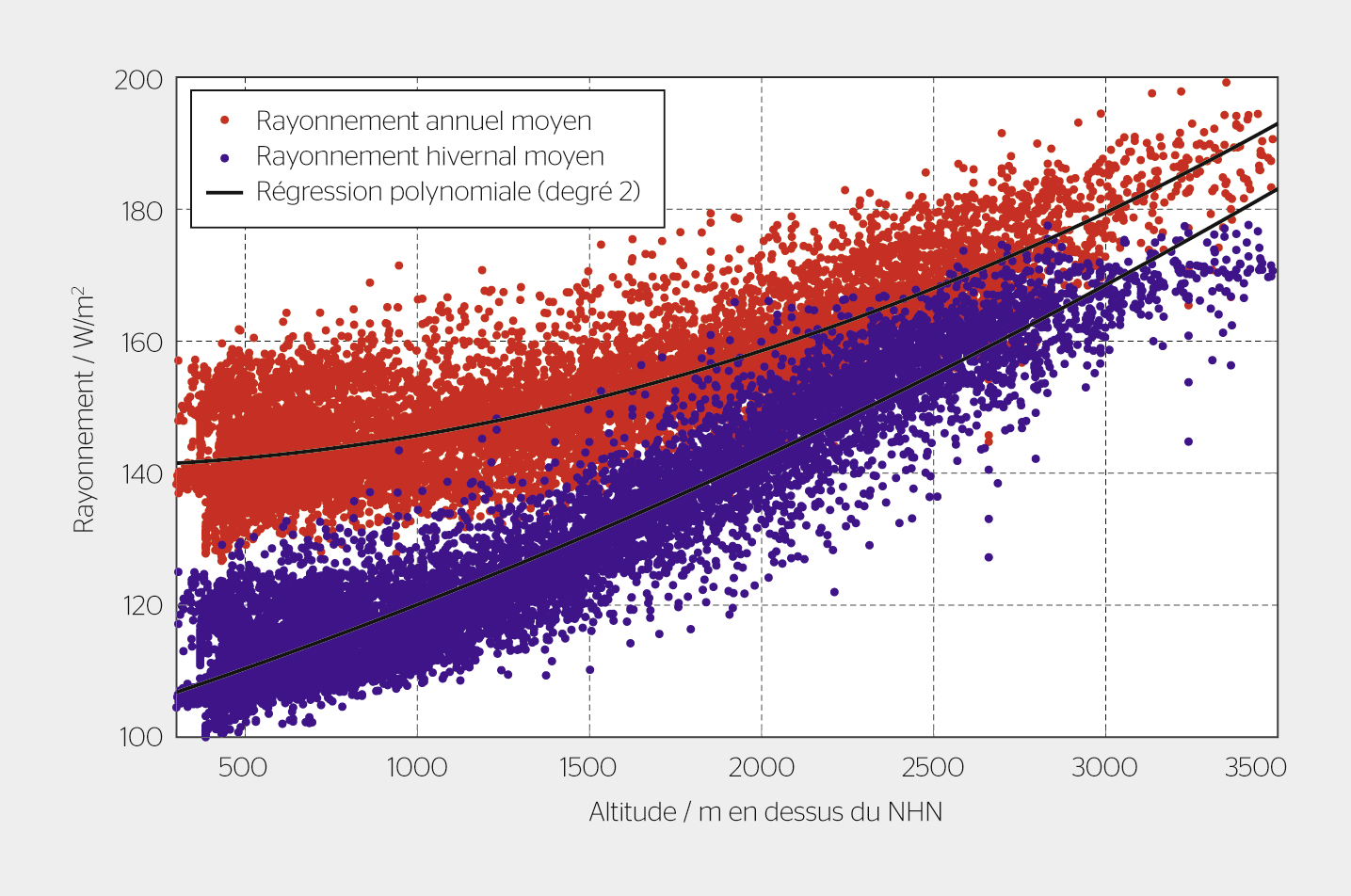 - À haute altitude, l’irradiation solaire est plus intense. Premièrement, l’atmosphère est plus mince, de sorte qu’une proportion moindre du rayonnement solaire est absorbée avant qu’il n’atteigne la surface du module. Deuxièmement, le brouillard et la couverture nuageuse se limitent en hiver souvent à la plaine, alors qu’en montagne, la totalité de l’énergie solaire est disponible.