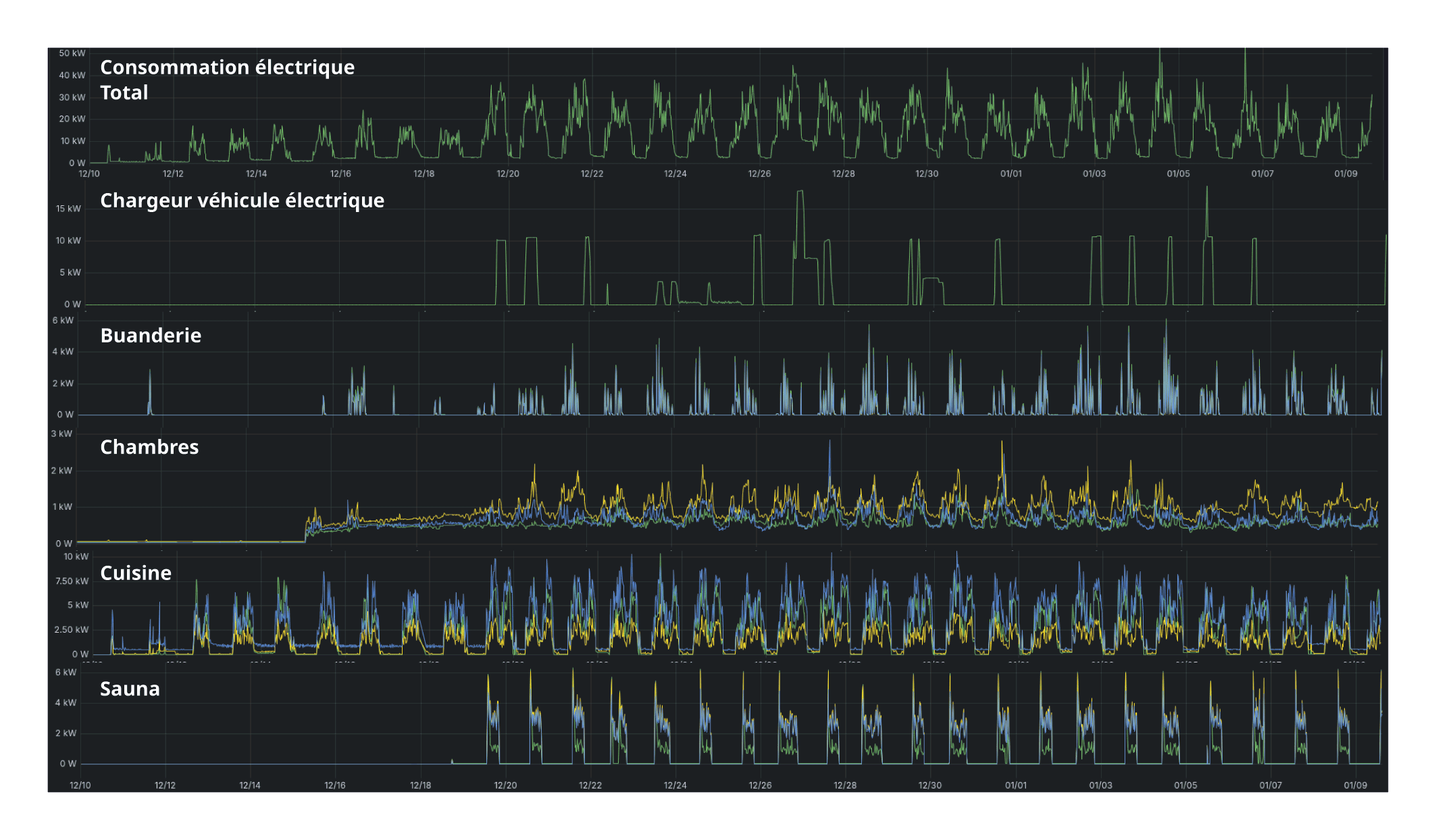 Pour comprendre concrètement le fonctionnement d’un microgrid de nouvelle génération, il faut se baser sur les données fournies quotidiennement par les capteurs GED. Les mesures réalisées dans les trois sites du pilote suisse – la coopérative de Meyrin, le site de Fribourg, et le site de Val d’Anniviers (un hôtel, un restaurant d’altitude, des bornes de recharge pour véhicules électriques et des remontées mécaniques) – révèlent une réalité énergétique très différente selon les lieux. Dans un hôtel de montagne, par exemple, les courbes de consommation indiquent des rythmes très marqués: pics de la cuisine, chambres en transition rapide, sauna ou spa à des horaires réguliers, et recharges de véhicules électriques plus concentrées certains jours (figure 1). Ce ne sont pas des modèles, mais les usages réels, et c’est à partir de ces usages que le système commence à travailler.