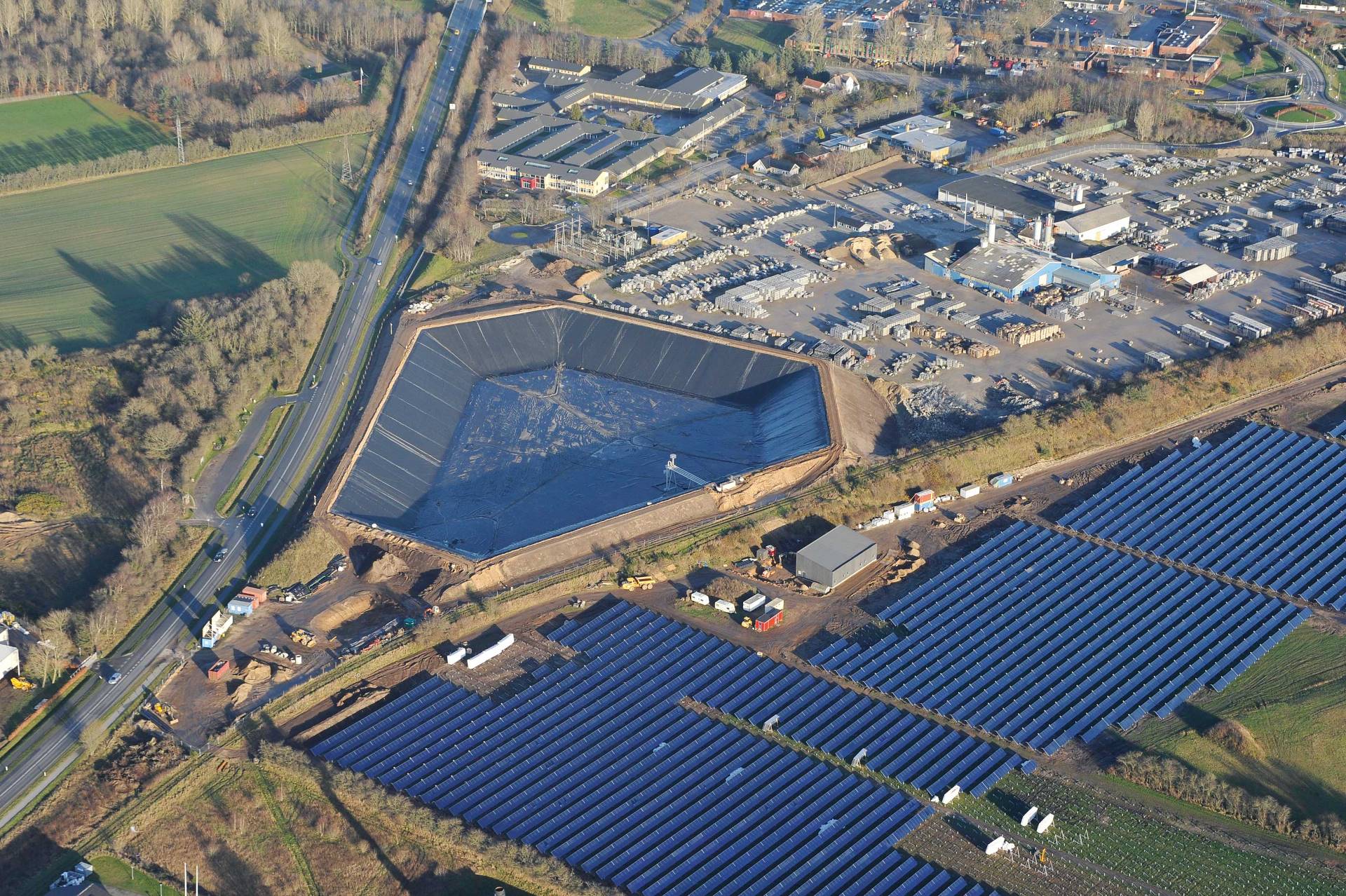 Enfin, le stockage en réservoir d’eau semi-enterré ou isolé (PTES, Pit Thermal Energy Storage) ne nécessite pas de forage, mais le creusement d’une fosse remplie d’eau, dont le fond est revêtu d’un «liner» assurant l’imperméabilité, souvent couverte d’un dôme flottant isolant. La température peut dépasser 80°C, et la stratification est plus contrôlable que dans les ATES et les BTES. Cette solution ne nécessite pas de géologie particulière; en revanche, elle a une emprise au sol significative (figure de titre). Ainsi, pour un volume de 100'000 m3 et une profondeur de 10 m, il faut disposer d’un hectare de terrain. Les PTES sont dédiés aux réseaux de chaleur et peuvent avoir un rendement qui dépasse les 80%.