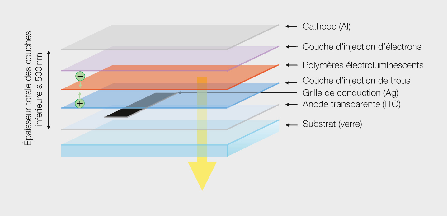Les OLED sont, quant à elles, des sources de lumière plates de faible épaisseur (inférieure à 2 mm) et de relativement grande surface, typiquement 10 x 10 cm2. Leur fabrication est basée sur l’utilisation de plusieurs couches organiques, des couches de molécules à base de carbone. Comme pour les LED, les couches actives sont constituées de matériaux semi-conducteurs (organiques pour les OLED) au sein desquels sont émis des photons lors de la recombinaison d’électrons et de trous.