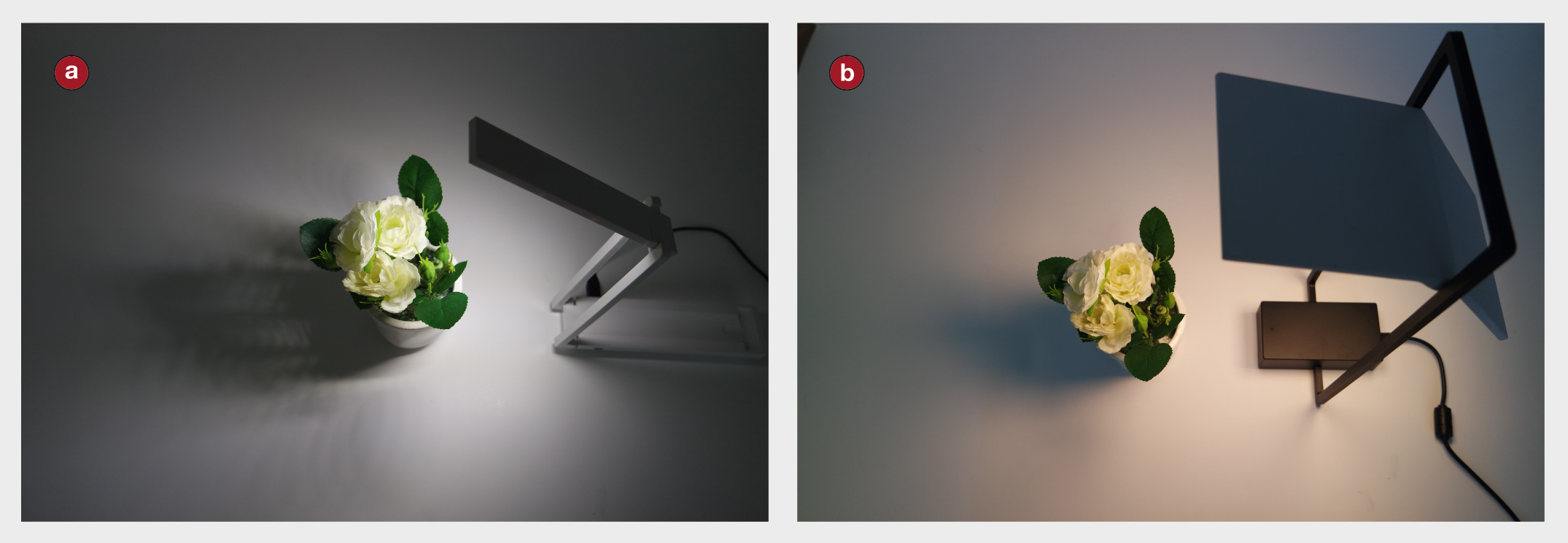 Les OLED permettent de réaliser des sources de lumière d’intensité variable, non éblouissantes, extrêmement fines, efficientes, émettant une belle lumière diffuse et douce, uniforme dans toutes les directions (émission lambertienne) et ne projetant que peu d’ombre ou une ombre floue (figure 3). Ces caractéristiques réduisent notablement la fatigue oculaire, offrant ainsi un véritable confort aux personnes exposées plusieurs heures par jour à la lumière artificielle. Il s’agit d’ailleurs, à l’exception des ampoules à incandescence, de la source artificielle dont le spectre est le plus proche de celui de la lumière naturelle. Les spectres d’émission des molécules organiques sont en effet plutôt larges et les différents semi-conducteurs organiques utilisés pour obtenir de la lumière blanche émettent des photons de différentes énergies. Finalement, elles n’émettent pas d’UV et, contrairement à certaines LED, elles n’affichent pas un pic d’intensité dans le bleu.