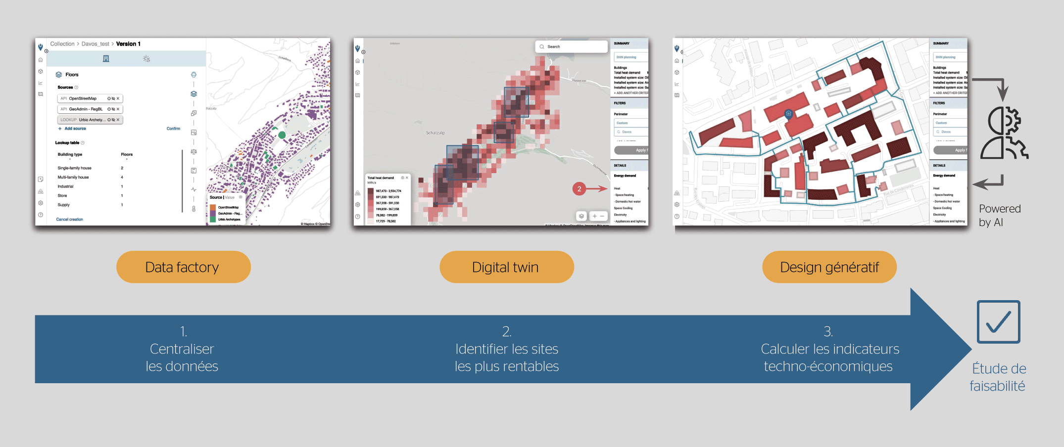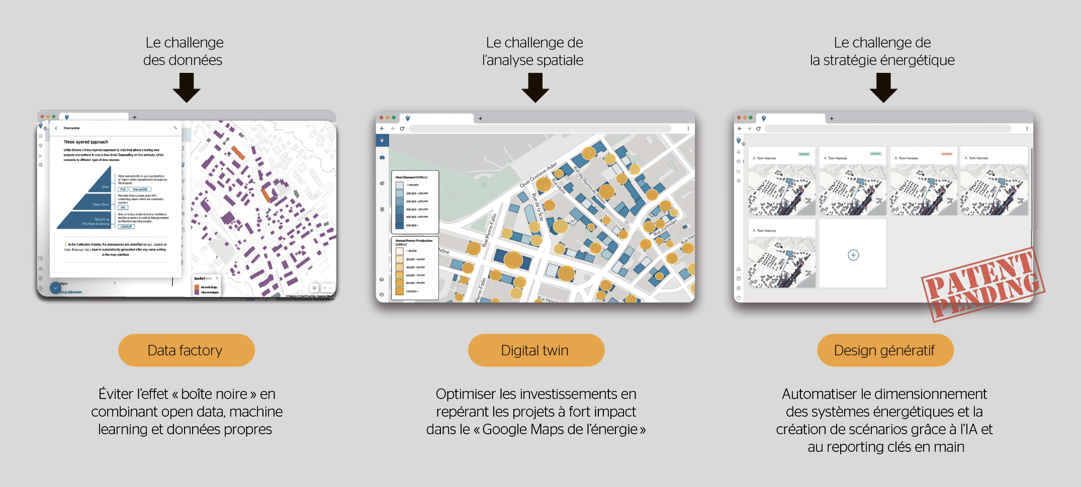 Chaque module a une fonction bien spécifique. La «data factory» centralise et combine plus de 80 sources de données différentes, y compris des sources open data. Viennent s’y ajouter des attributs provenant de modèles de machine learning, voire de bases de données des utilisateurs. Si, historiquement, la collecte et le traitement manuels de données pouvaient représenter jusqu’à la moitié d’un budget de planification énergétique, cette solution peut réduire les coûts à moins de 1% du budget total.