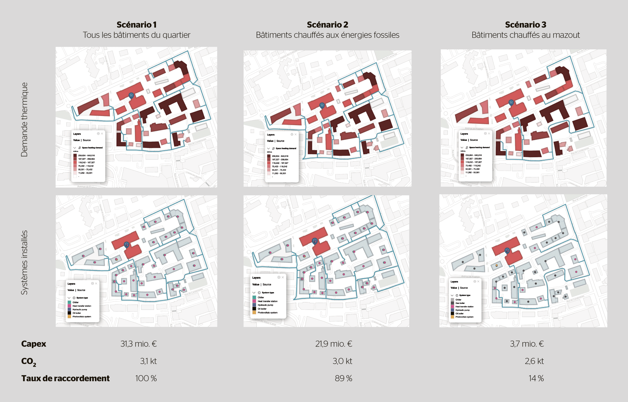 L’avantage principal de cette approche entièrement digitalisée consiste dans le fait qu’elle permet de comparer des variantes répondant à différents objectifs et de ne retenir que celles correspondant aux objectifs stratégiques visés. La figure 3 illustre comment trois scénarios indicatifs – générés à la volée par l’IA selon les objectifs de l’utilisateur – peuvent facilement être comparés. Le scénario 1 présente une solution ambitieuse, dans laquelle l’intégralité des bâtiments du site est raccordée au réseau. La réduction des émissions de gaz à effet de serre y est la plus importante, mais également les coûts d’investissement. À l’inverse, le scénario 3 ne vise qu’à raccorder un seul type de bâtiment, en l’occurrence ceux chauffés au mazout. Dans ce scénario, près de 84% des émissions peuvent être économisées pour seulement 14% des bâtiments raccordés et environ un dixième des coûts d’investissement, ce qui représente une solution stratégique si tel est l’objectif visé. Au final, la décision appartient aux utilisateurs, qui peuvent explorer plus d’une centaine de critères disponibles dans la plateforme et ainsi optimiser les investissements.