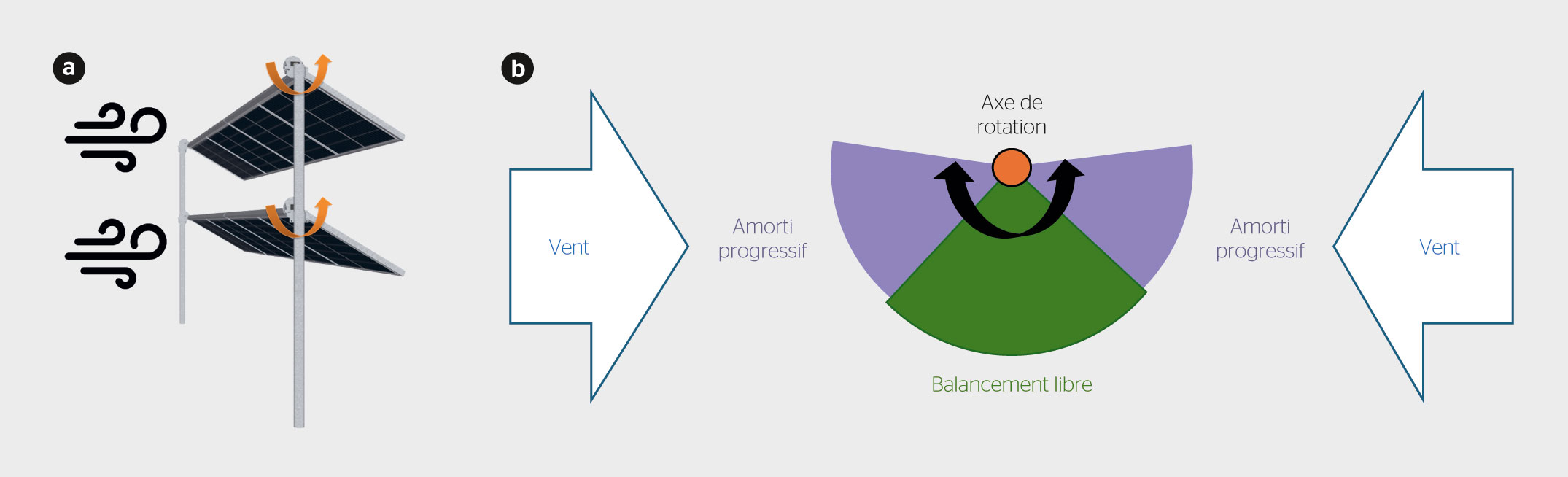 Pourquoi cette solution a-t-elle été si complexe à développer? S’ils étaient pris dans une tempête centennale, les panneaux PV bi-verre balançants s’apparenteraient, malgré leur poids, à des drapeaux suspendus: ils dépasseraient l’horizontale en cas de rafales, deviendraient instables et «battraient» dans le vent. Ils risqueraient alors de voler en éclat, et les efforts au niveau de l’axe de rotation seraient si élevés qu’une telle installation ne présenterait plus aucun avantage par rapport à une solution avec des panneaux verticaux fixes. Il est donc nécessaire d’amortir la rotation des panneaux pour éviter ces instabilités, mais uniquement à partir d’un certain angle (figure 3b), car il est essentiel que les panneaux se mettent le plus vite possible dans l’axe du vent en cas de rafale. La mise au point d’un tel système a nécessité une approche itérative, combinant simulations numériques et tests empiriques.