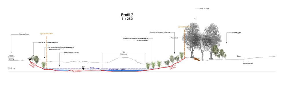 L’autre mesure R+R phare du projet MBR – le réaménagement de l’embouchure de l’Avançon – consiste à renaturer le linéaire aval et l’embouchure de l’Avançon grâce à un élargissement du lit et à mettre en œuvre des biotopes humides de part et d’autre du cours d’eau. L’Avançon sera élargi afin de garantir la formation d’une surface maximale de milieux caractéristiques d’un écosystème de type alluvial. Cet objectif sera atteint grâce à la mise en œuvre d’un lit majeur à caractère alluvial ainsi que d’un lit mineur d’une vingtaine de mètres de large garantissant la connectivité piscicole avec le Rhône. Les berges de l’Avançon seront remodelées en pente douce et variable. Leur végétalisation offrira également de nouveaux refuges pour la petite faune.