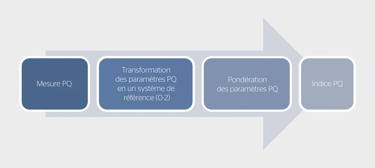 Les valeurs des paramètres PQ sont réparties dans le système de référence sur un intervalle de 0 à 2 – 0 correspondant à la valeur nominale, 1 à la valeur moyenne et 2 à la valeur limite. L’indice PQ se compose de trois sous-indices: PQAvg, PQMax et PQ99. Le sous-indice PQAvg correspond à la moyenne arithmétique de tous les paramètres PQ référencés et décrit la qualité moyenne de la tension. PQMax représente le plus mauvais paramètre PQ et permet ainsi de détecter les dépassements de valeurs limites. Le sous-indice PQ99 est une combinaison de PQAvg et PQMax. Dans ce sous-indice, certaines valeurs aberrantes des paramètres PQ sont fortement mises en évidence, tandis que de faibles variations des paramètres PQ sont certes indiquées, mais pas surestimées. La figure 2 et la figure 3 présentent le calcul et les valeurs seuils de l’indice PQ. La méthodologie développée est une première mise en œuvre de l’approche. Elle sera retravaillée dans le nouveau projet QuVert à l’aide de réflexions et de données de mesure supplémentaires [6].