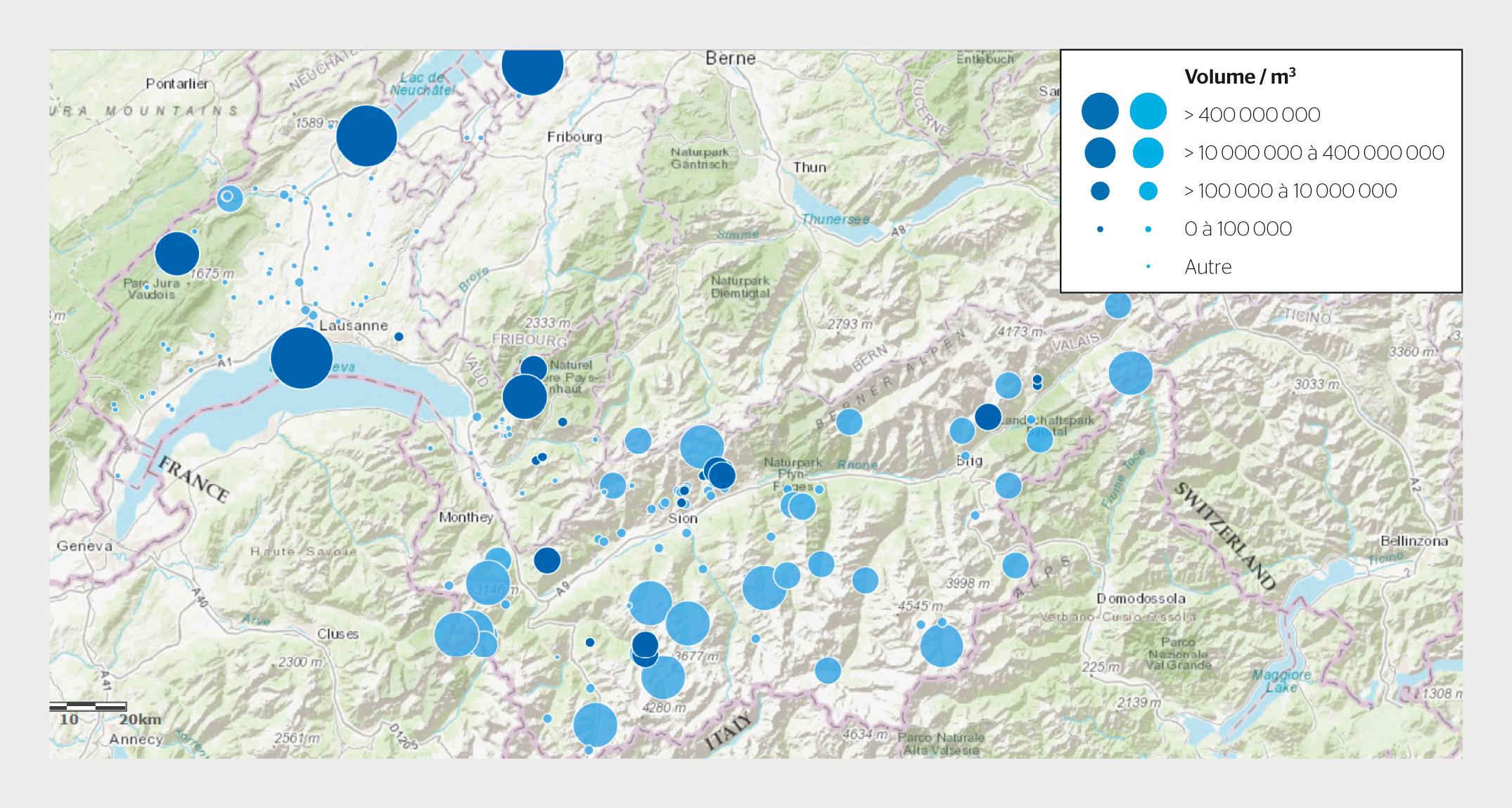 <strong>Figure 1</strong> Réservoirs recensés dans les cantons de Vaud et du Valais (bleu clair) avec mise en évidence des réservoirs potentiellement utilisables (bleu foncé).