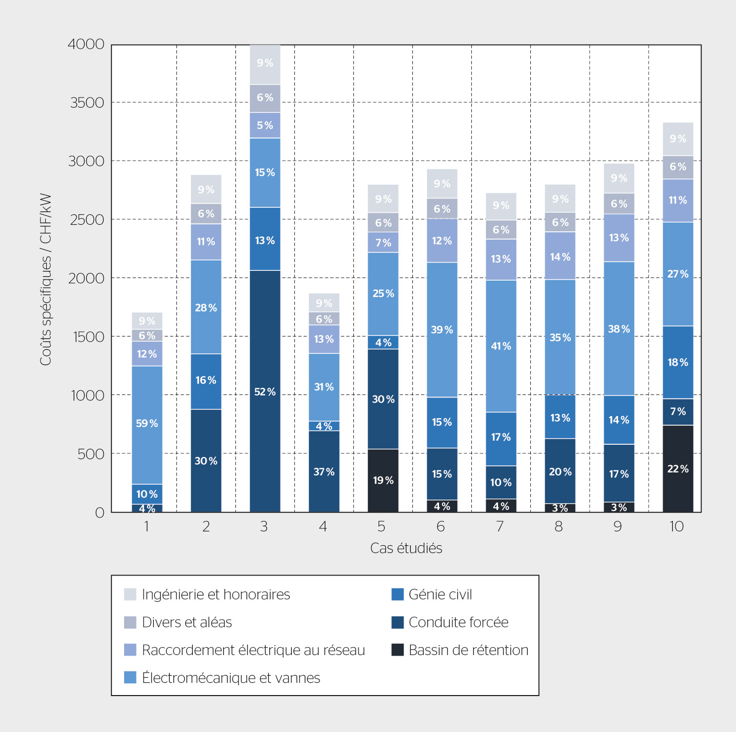 Figure 3 Coût spécifique d’investissement (CHF/kW) des différents cas étudiés avec pourcentages d’investissement par parties prépondérantes. | Figure: HES-SO Valais