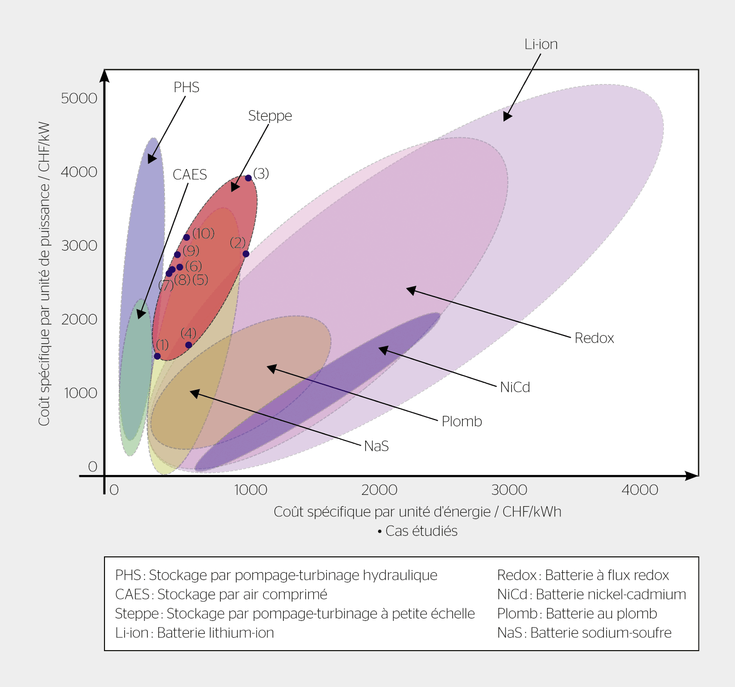 <strong>Figure 4</strong> Comparaison des coûts spécifiques de différentes solutions de stockage d’énergie.