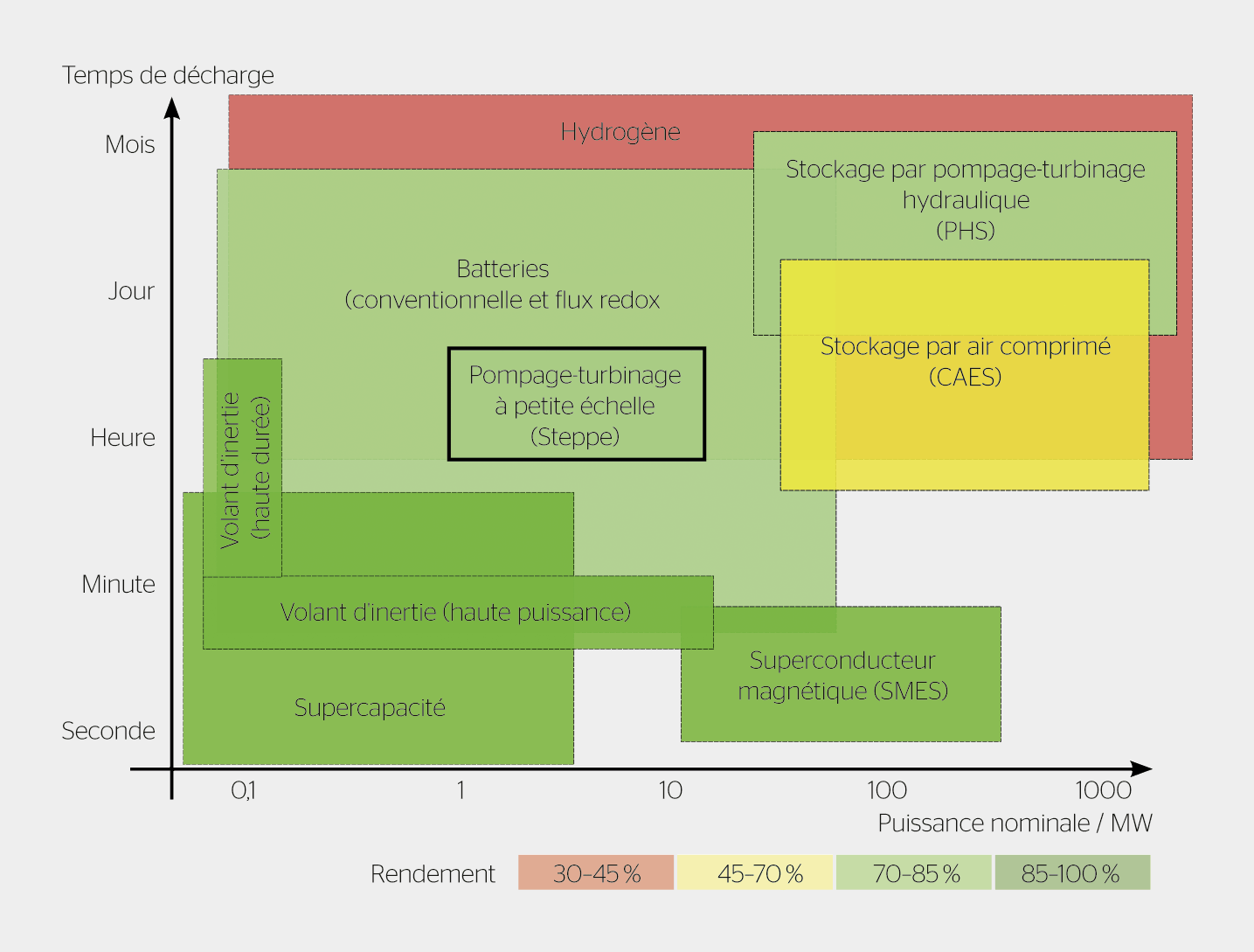 Figure 5 Temps de décharge, puissance et rendement de diverses technologies de stockage. | Figure: HES-SO Valais d’après [11]