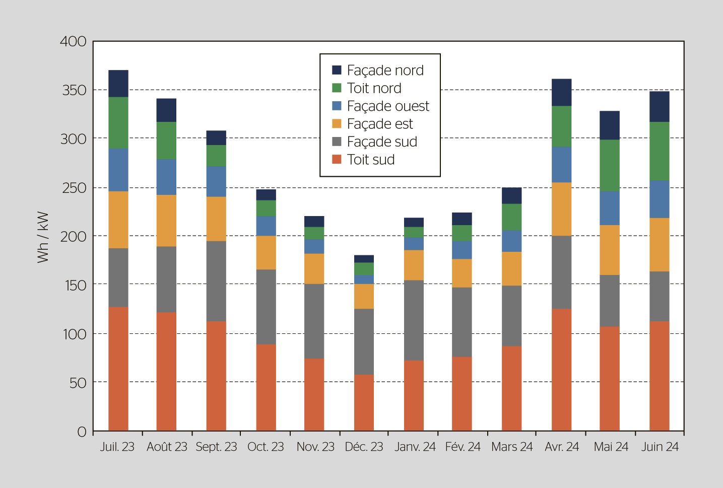 En hiver, les façades solaires présentent deux avantages: premièrement, elles ne sont pas recouvertes de neige, et deuxièmement, elles profitent du rayonnement solaire plus horizontal pendant la saison froide et des réflexions sur la neige. Les façades solaires peuvent également être utilisées en tant qu’élément conceptuel: il existe aujourd’hui de nombreuses possibilités en termes de format, de surface et de couleur. De plus, le verre constitue en principe un matériau de grande qualité pour les façades, car il est extrêmement résistant et peut être facilement nettoyé en cas de besoin. Seuls les coups d’entaille mécaniques qui peuvent endommager les verres solaires trempés posent problème.