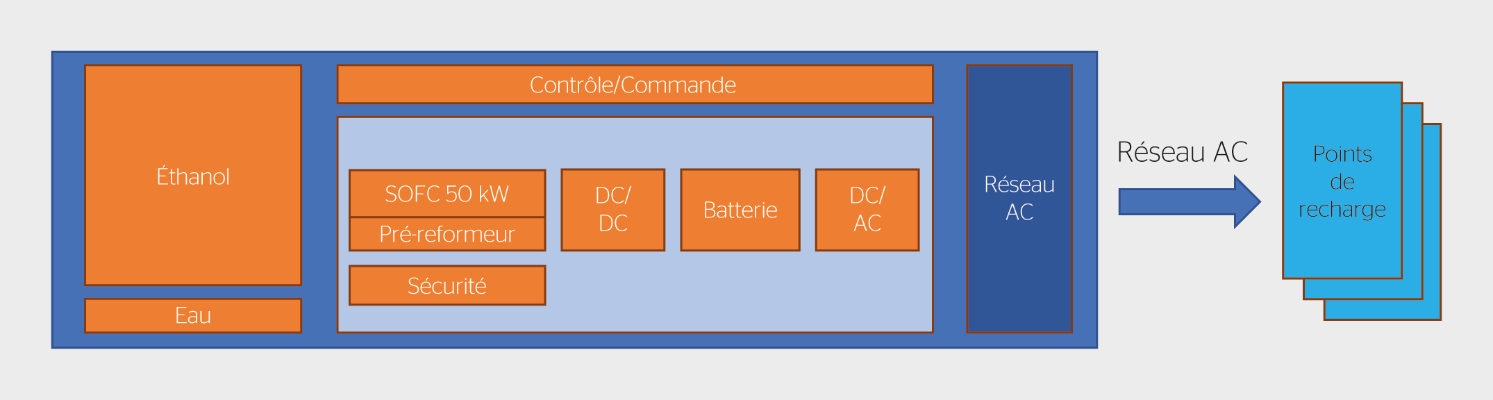 Le générateur fonctionne selon le principe suivant (figure 1): un réservoir principal d’éthanol fournit le carburant au pré-reformeur via une pompe. Celui-ci le transforme en une pluralité de gaz de synthèse consommables par la pile SOFC. Cette dernière produit un courant électrique qui est géré par l’électronique de puissance. L’énergie non utilisée par les points de recharge est stockée dans une batterie tampon et servira aux phases transitoires ainsi qu’éventuellement aux demandes supérieures à la puissance maximale de la pile elle-même.