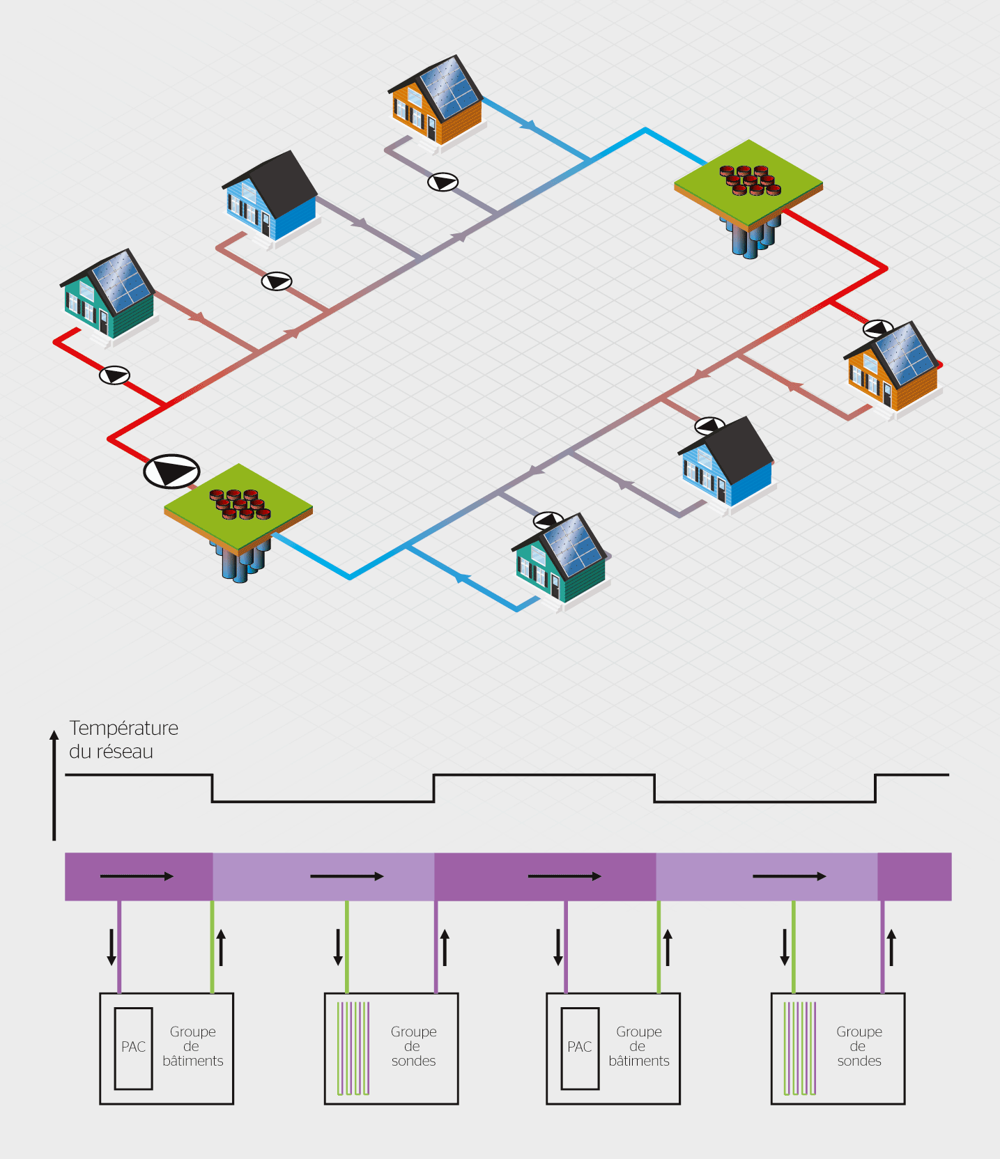 La température circulant dans les réseaux anergie n’est pas directement utilisable pour le chauffage, mais est valorisée par l’utilisation de PAC localisées chez les consommateurs. Cette topologie permet en outre de fournir du froid pendant l’été, ce qui est d’autant plus pertinent que cette demande sera amenée à augmenter dans les années à venir. Enfin, cette technologie rend possible le regroupement de consommateurs ayant des profils de besoins différents, créant ainsi une synergie au sein du réseau. Par exemple, il est possible de produire de l’eau chaude dans un bâtiment en utilisant les rejets thermiques provenant du refroidissement d’un autre bâtiment, et ce, via le réseau anergie.
