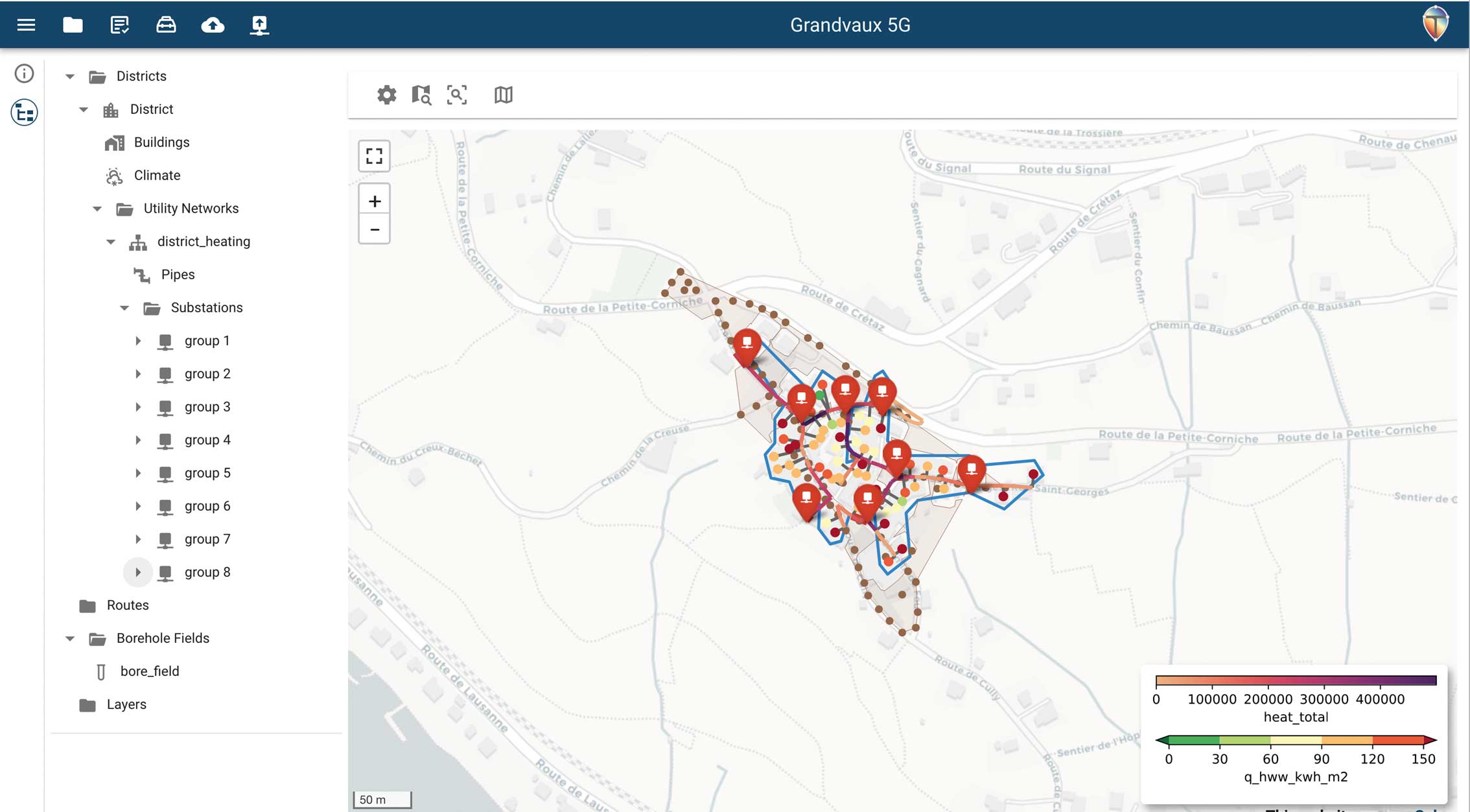 Le village de Grandvaux, l’une des localités de la commune de Bourg-en-Lavaux, a servi de cas d’étude. Il possède 67 bâtiments, avec des besoins en matière de puissance par bâtiment allant de 10 kW à 140 kW, pour un besoin global en chaleur de 2,3 GWh/a. Cette étude a montré, d’une part, qu’il est possible d’utiliser les routes du village comme surface de forage et, d’autre part, que la solution optimale consiste à répartir les bâtiments en groupes de six à dix bâtiments reliés en série à la boucle anergie monotube, avec des groupes de huit sondes géothermiques intercalés entre les groupes de bâtiments. Cette solution permet d’aboutir à un ratio avantageux d’environ une sonde par bâtiment de besoins moyens en chaleur de 35 MWh.