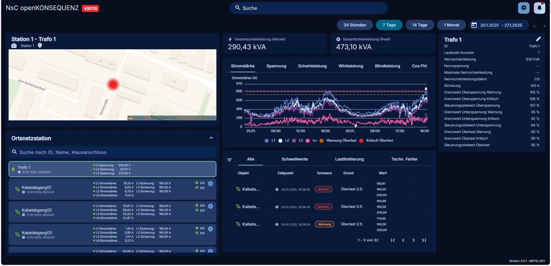 Das Niederspannungscockpit ist eines der Software-Entwicklungsprojekte von OpenKonsequenz. Es handelt sich um ein Softwaremodul, das Netzbetreibern einen umfassenden Überblick über die Zustände im Niederspannungsnetz gibt.