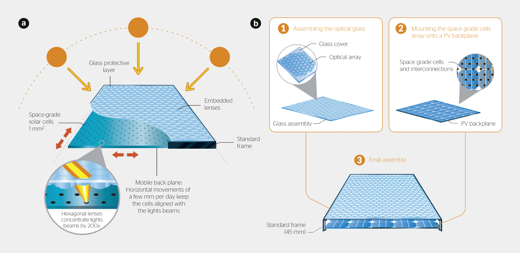 Die neue Technologie basiert auf dem Prinzip des Mikro-Tracking: Die Hochleistungs-PV-Zellen werden in Bezug auf die Linsen mechanisch bewegt, damit die direkte Sonnenstrahlung stets auf die PV-Zellen (Bild 1a) fokussiert ist. Die Konzentration ist deshalb so wichtig, weil die Hochleistungszellen, die aufgrund ihrer Kosten normalerweise auf Anwendungen der Raumfahrttechnik beschränkt sind, einen sehr hohen Wirkungsgrad besitzen, meistens mehr als 42% mit dem in diesem Projekt verwendeten Konzentrationsfaktor (200 x). Weiterer Vorteil: Die mit diesen Zellen bestückte Fläche entspricht nur einem winzigen Teil, d. h. einem Zweihundertstel der Gesamtfläche des Moduls, was ebenfalls zur Kostenreduzierung beiträgt. Dank dieses Konzepts konnte man bereits mit der ersten Architektur einen Wirkungsgrad von 29% erzielen. [2]