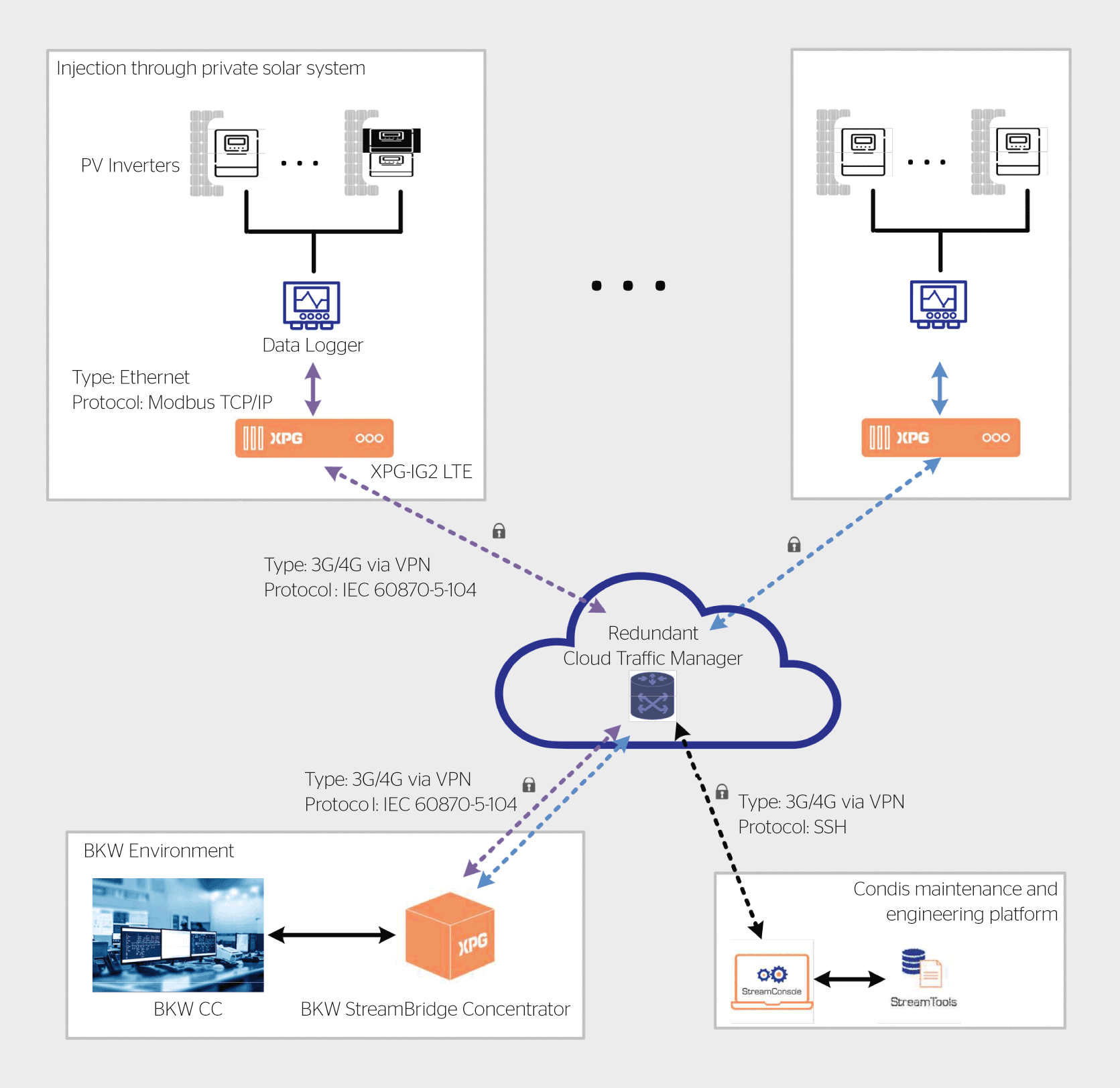 Die Firma Condis hat deshalb für BKW Power Grid eine Lösung erarbeitet, die diese Herausforderungen effizient meistert. Während der Montage der Anlage werden die verschiedenen Solarzellen zuerst mit einem Wechselrichter verbunden, der den Strom direkt ins Netz speist. Für die lokale Überwachung und Steuerung der Anlage und des Wechselrichters wird vom Solarmonteur auch ein Datenlogger installiert. Dieser ist oft mit dem Internet verbunden, so dass der Besitzer seine Anlage (meist über ein Webportal) überwachen und steuern kann. Zwar könnte der Netzbetreiber auch über diesen Weg die Anlagen steuern, aber aus folgenden Gründen ist dies weniger realistisch: