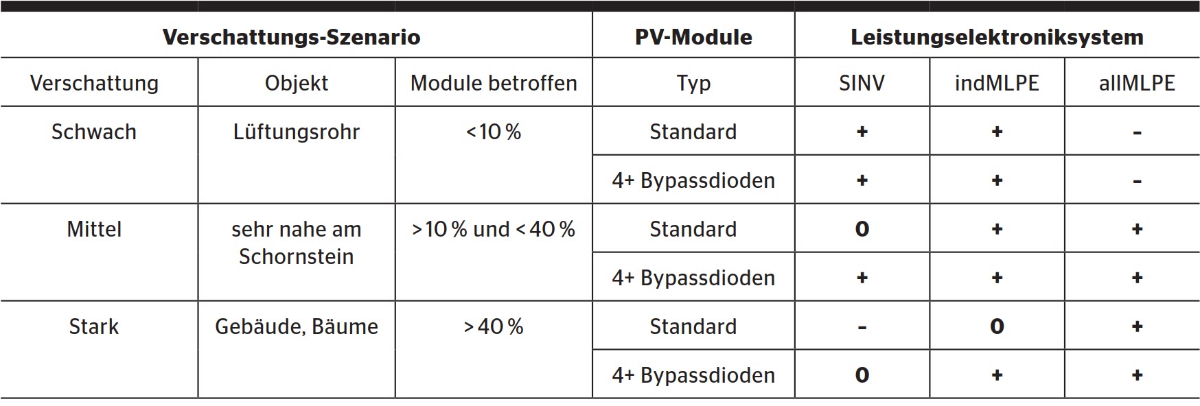 - Der Einsatz von verschattungstoleranten Modulen kann vergleichbare Erträge erbringen, wenn sie gleich ausgerichtet sind. Mehr als drei Bypass-Dioden im Modul sind förderlich. Details siehe IEA-Report [2].