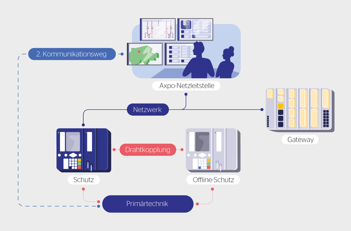 Das Lösungskonzept von Axpo hat zwei Betriebsmodi: Im Normalbetrieb sind beide Schutzgeräte aktiv und können auf die Primärtechnik wirken. Fernschaltungen sind nur mit dem Gerät für den Normalbetrieb möglich, da nur dieses Gerät kommunikativ ist. In dieser Situation stehen alle Funktionen des Unterwerks zur Verfügung, und ein effizienter Betrieb über die Netzleitstelle ist sichergestellt.