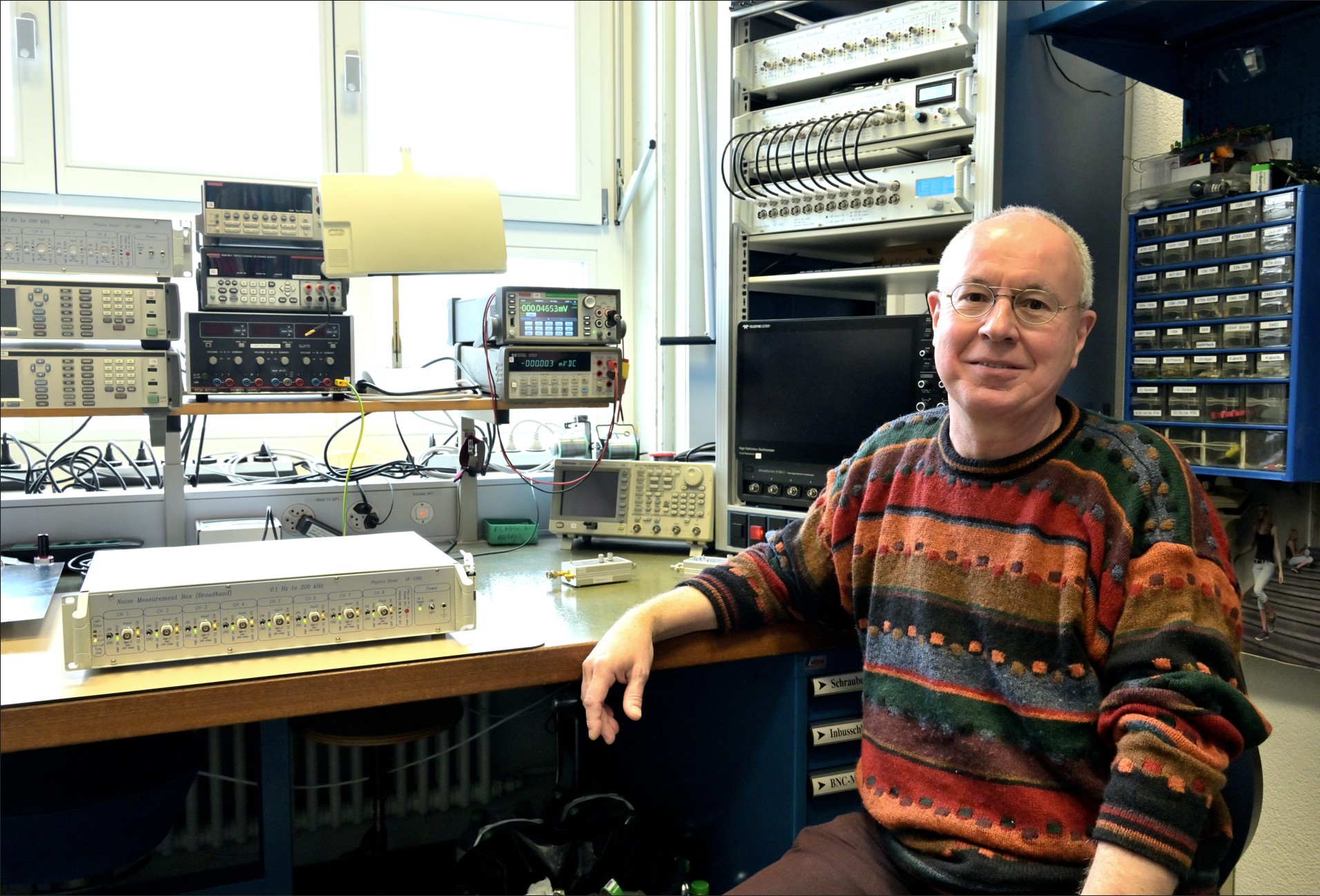 Nein, aber was man filtern kann, ist natürlich das hochfrequente Rauschen. Oft ist der Bereich von 0,1 bis 10 Hz heikel. Häufig spezifizieren Konkurrenten dort gar nichts, sondern starten mit den Rausch-Spezifikationen ab 10 Hz. Aber dieser tieffrequente Bereich ist bei uns sehr wichtig. Das erreicht man nur mit Referenzquellen, die temperaturstabilisiert sind. Die Elektronik ist auch doppelt geschirmt: Im Gehäuse hat es noch ein Aluminiumgehäuse. Das hat den Vorteil, dass die Elektronik im inneren Gehäuse auf einem anderen Potenzial sein kann als im Aussengehäuse. Um Erdschlaufen zu vermeiden, ist die Referenz-Masse potenzialfrei und die Schaltung im inneren Gehäuse wird mit einem potenzialfreien Netzteil versorgt. Um die Signalwege möglichst kurz zu halten, werden die Geräte direkt auf die Experimente gesteckt – ohne Verbindungskabel.