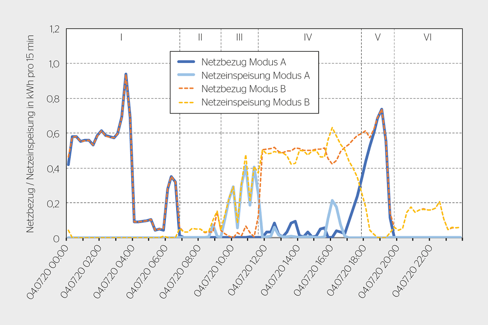 Obenstehendes Bild zeigt die 15-minütlichen Lastgangdaten an einem ausgesuchten Tag. Ist der Speicher leer und erzeugt die PV-Anlage keine elektrische Energie, bezieht das Einfamilienhaus die komplette Energie aus dem Netz (Zeitabschnitt I). In diesem Zeitraum messen Modus A und B genau das Gleiche. In den Zeitabschnitten II und IV speist das Energiemanagementsystem die Energie von der PV-Anlage symmetrisch über alle Phasen aus. Der Energiebezug ist aber nicht über alle Phasen gleich verteilt. Daher ergibt die Messung mit dem Modus B gleichzeitig einen Bezug und eine Rücklieferung. Der Zeitabschnitt III beschreibt einen Zeitraum, in dem das Einfamilienhaus keine nennenswerte Menge an elektrischer Energie bezieht, weshalb die beiden Messmethoden dieselben Energieeinspeisungen messen. Für den Zeitabschnitt V wird angenommen, dass ein Gerät während dieser Zeit dreiphasig bezogen hat und sowohl Modus A als auch B denselben Bezug massen.