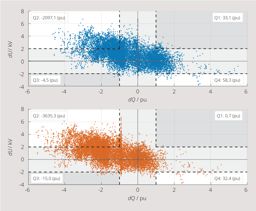 Pour la planification et la mise en œuvre d’éventuels changements de tension dans le domaine de la moyenne tension (ainsi qu’à des niveaux supérieurs), il est donc indispensable d’effectuer un suivi systématique de la production accrue de puissance réactive . Les capacités de compensation existantes dans le réseau doivent être vérifiées et intégrées de manière quantitative dans le calcul global, afin d’éviter à l’avenir des coûts supplémentaires liés à l’échange de puissance réactive non conforme.