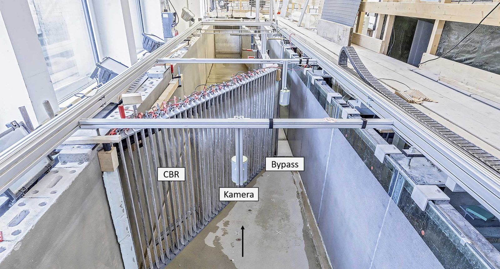 Claudia Beck hat im Rahmen ihrer Doktorarbeit einen Vertikalrechen entwickelt, dessen vertikale Stäbe nicht gerade sind wie in bisher gebräuchlichen Vertikalrechen, sondern gebogen (engl. Curved-Bar Rack/CBR). Dieser neuartige Vertikalrechen leitet die Fische im Labor wirksam zum Bypass und verursacht aufgrund der strömungsoptimierten Stabform deutlich geringere Verluste in der Stromproduktion. Im Rahmen eines vom BFE unterstützten Zusatzprojekts hat die Forscherin im Herbst 2019 untersucht, ob sich dieser vertikale Rechen durch Elektrifizierung weiter verbessern lässt, insbesondere für Aale, die durch den Rechen bisher unzureichend geschützt sind. Zu diesem Zweck wurde der 30 m lange Versuchskanal der VAW mit einem Rechen ausgerüstet, an den eine zwischen 38 und 80 V regulierbare Spannung aufgebracht wird. Anschliessend wurde untersucht, wie sich Aale und Schneider verhalten, wenn sie sich dem Rechen nähern.
