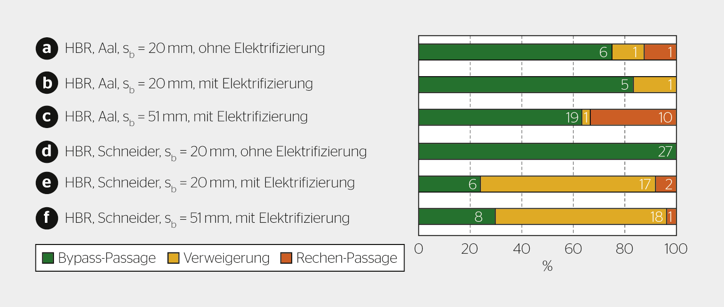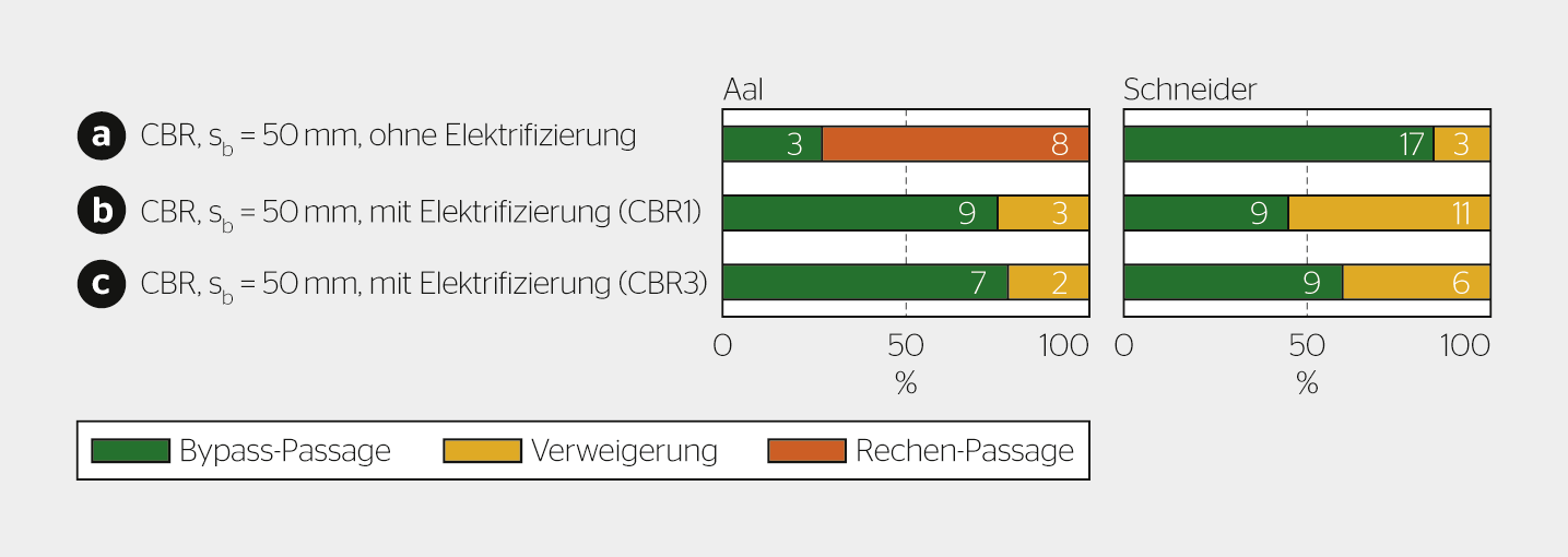 Ein Hauptergebnis der Studie: Der Aal profitiert in hohem Mass von der Elektrifizierung des CBR-Vertikalrechens. Während beim nicht elektrifizierten Rechen 73% der untersuchten Fische durch den Rechen schlüpften, war das mit der Elektrifizierung bei keinem der Tiere der Fall. Vielmehr schwammen die meisten Tiere zum Bypass. Die übrigen Tiere «verweigerten» die Passage, das heisst, sie gelangten weder zum Bypass noch durch den Rechen, sondern sie schwammen flussaufwärts zurück. Die Verweigerung ist zwiespältig: Für die Tiere ist zwar die Gefahr gebannt, die die Turbine für sie darstellt, allerdings um den Preis, dass sie auf die Wanderung flussabwärts verzichten, was aus ökologischer Sicht unerwünscht ist.