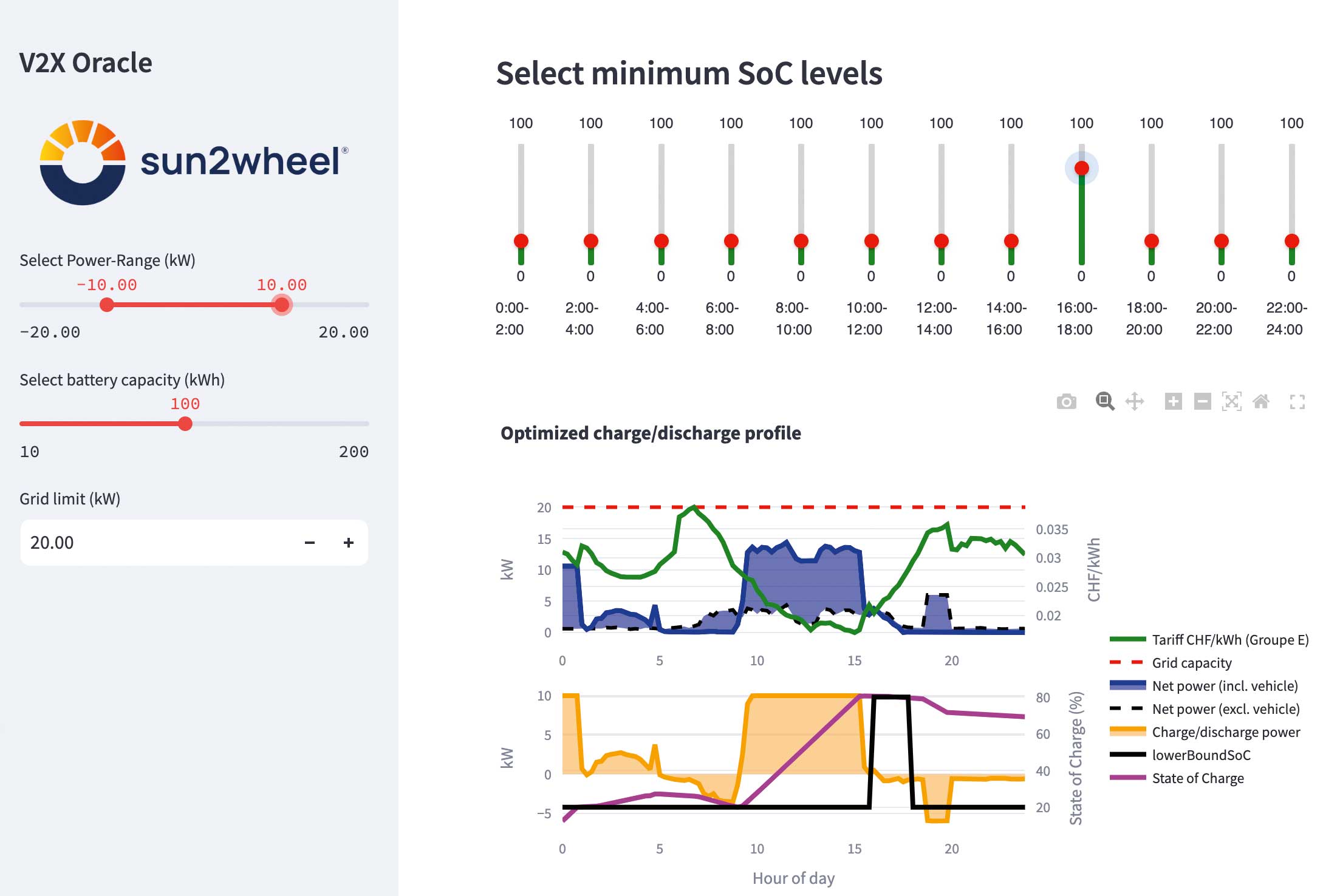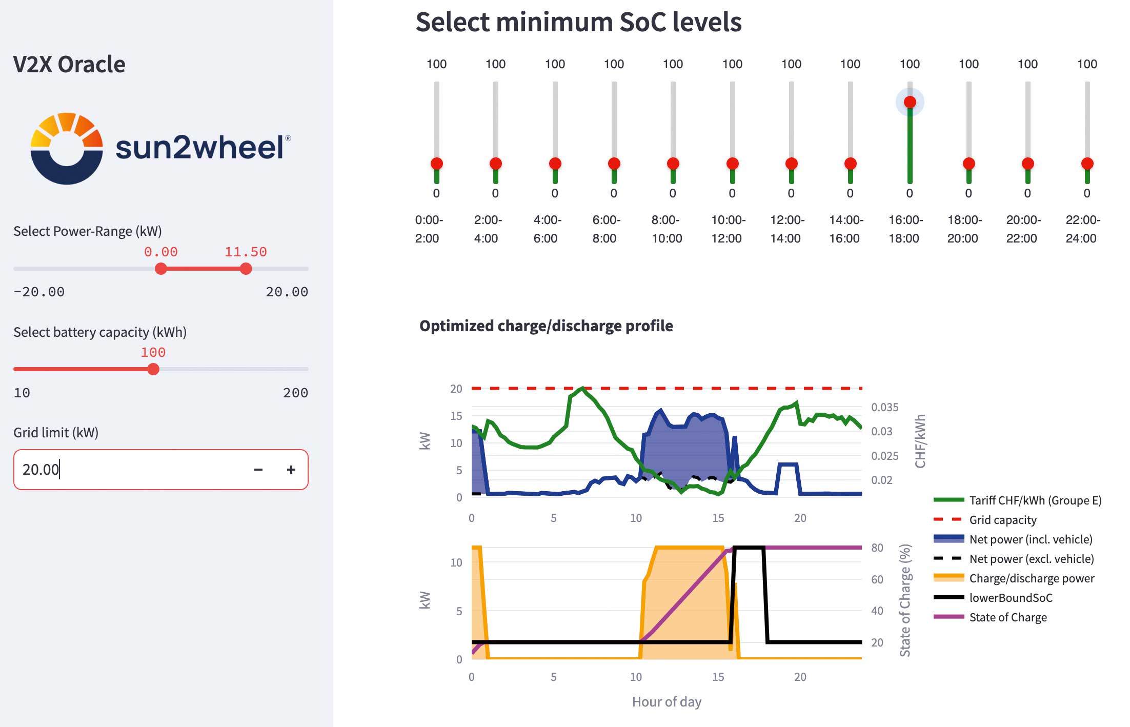 Sun2wheel konzentriert sich auf den Betrieb und geht von einer bereits definierten Infrastruktur aus. Anschliessend wird für jedes Fahrzeug bzw. jeden Speicher (unabhängig davon, ob er mono-, bidirektional oder stationär ist) eine Optimierung durchgeführt, die vollständig mit dynamischen Tarifen und lokaler Solarstromproduktion kombiniert werden kann.