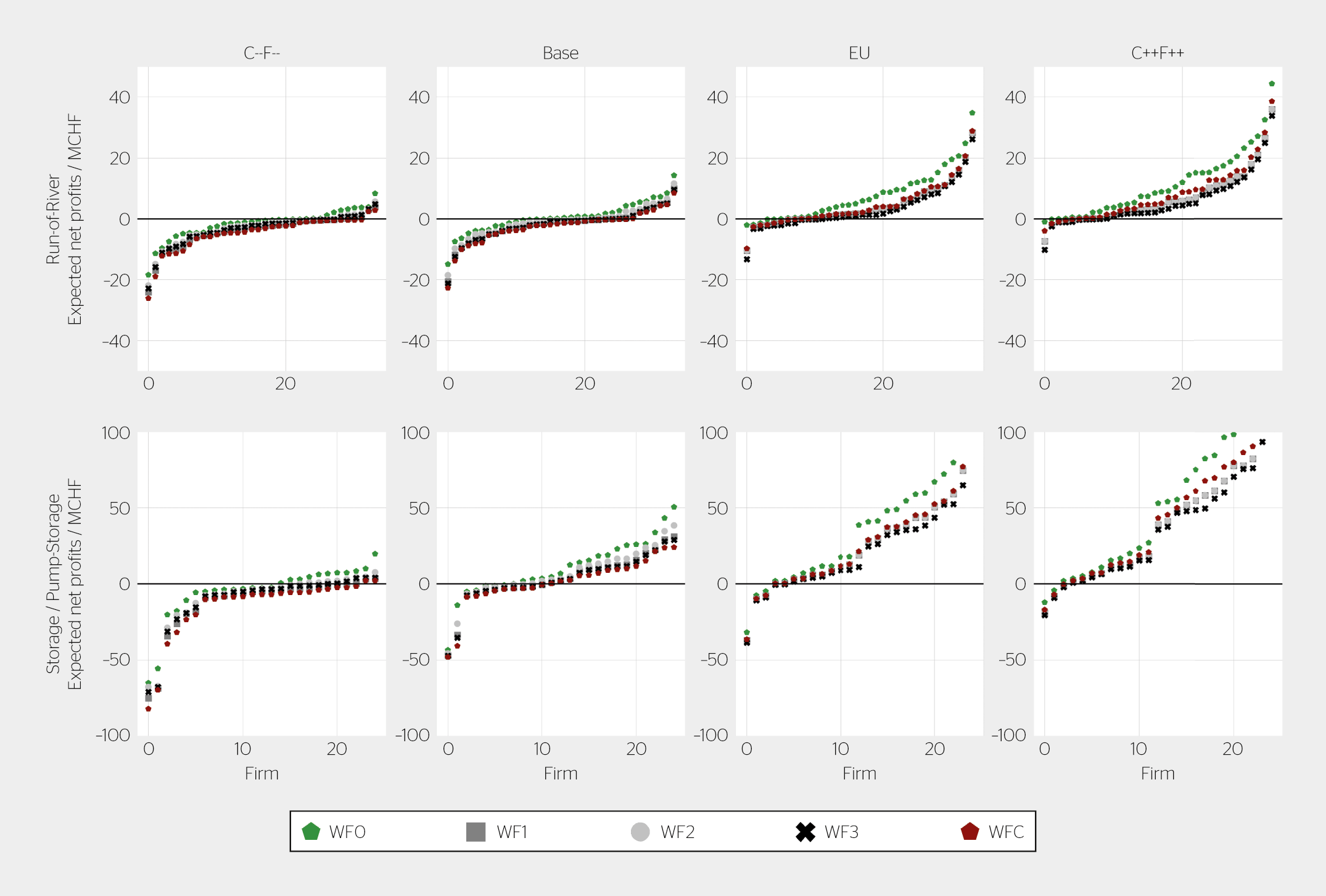 Aus Unternehmenssicht führen variable Wasserzinsen nicht unbedingt zu einer deutlich anderen Bewertung: Auch weiterhin dominieren die möglichen Marktentwicklungen die Rentabilitätsaussichten. Basierend auf einer Kostenschätzung für 62 Schweizer Wasserkraftunternehmen, welche zirka 63 % der Schweizer Wasserkraftproduktion abdecken, zeigt sich, dass unter günstigen Marktbedingungen auch die derzeitige feste Gebühr für die meisten Unternehmen nicht zu Verlusten führt, während eine vollständige Abschaffung der Gebühren unter negativen Marktentwicklungen nur wenige Unternehmen in die Gewinnregion treiben würde. Insbesondere wenn Marktpreis und Kostenniveau nahe beieinander liegen (das heisst innerhalb eines Bereichs von zirka 40 bis 60 CHF/MWh), können die Wasserzinsen die entscheidende Kostenkomponente darstellen. Allerdings zeigt die Untersuchung auch, dass die Gewinnspanne zwischen den 62 Firmen deutlich höher ist als die durch variable Wasserzinsen verursachten Verschiebungen (Bild unten).