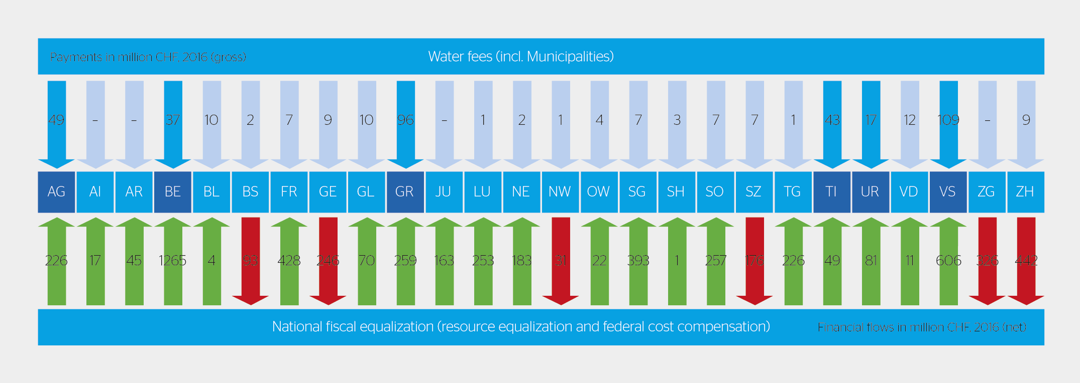 Auch ist die Bedeutung der Wasserzinseinnahmen in Relation zu anderen Budgetposten sehr heterogen. Insbesondere für die Bergkantone stellen die Wasserzinsen eine wichtige Einnahmequelle dar: Wallis und Graubünden erhalten rund 50 % der gesamten Wasserzinseinnahmen; Aargau, Tessin, Bern und Uri zirka 30 %. Diese Einnahmen stellen jedoch nur einen Teil der interkantonalen Transfers dar, was zum Beispiel im direkten Vergleich mit dem nationalen Finanzausgleich ersichtlich wird (Bild unten).