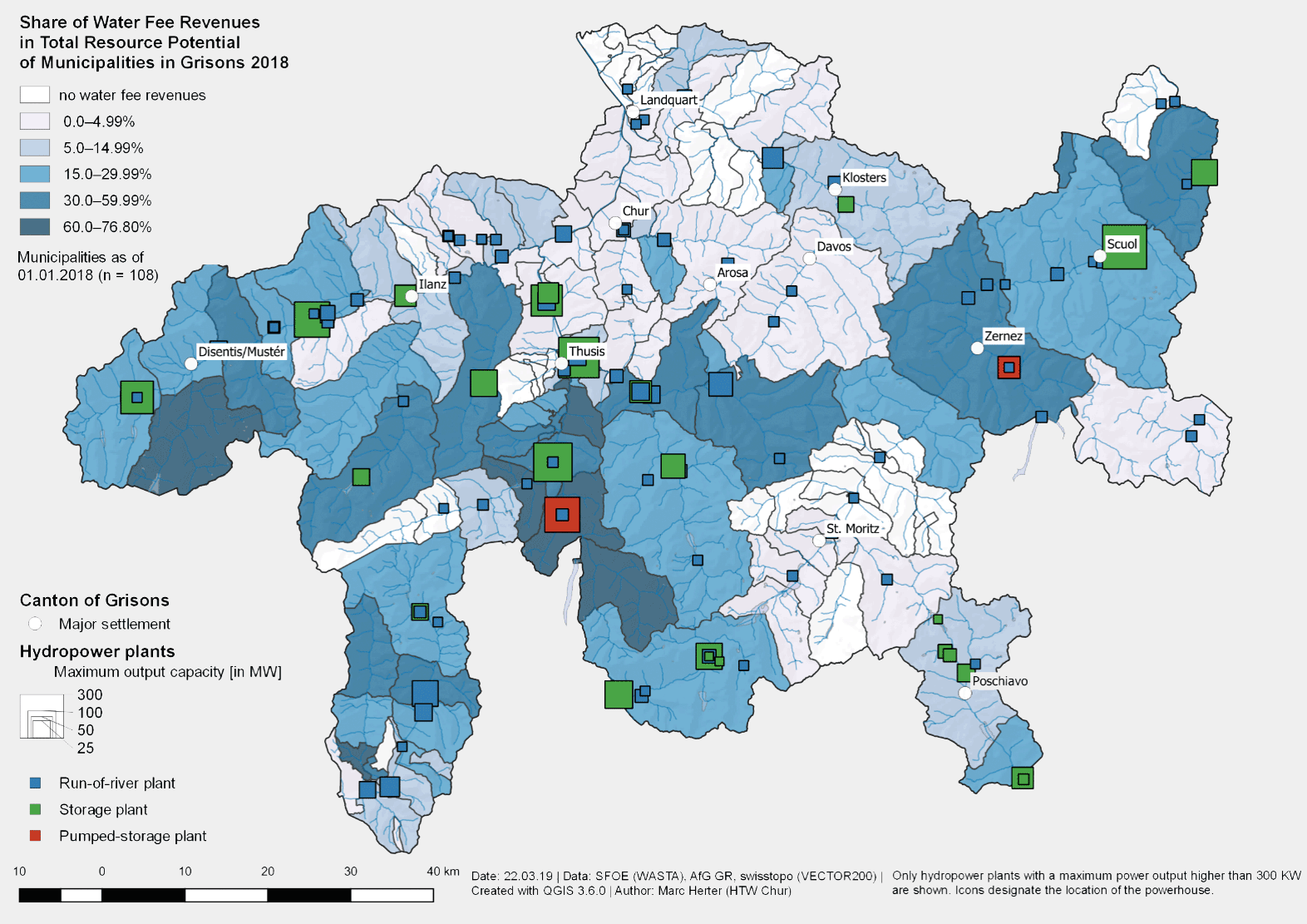 Am Bespiel Graubündens wird die Komplexität der Thematik Wasserzins ersichtlich. In Graubünden teilen sich der Kanton und die Konzessionsgemeinden die Zinseinnahmen zu gleichen Teilen. Vorliegende Analyse zeigt, dass diese Einnahmen ohne den ausgleichenden Effekt des innerkantonalen Haushaltsausgleichs zu erheblichen Disparitäten führen würden. Wie aus dem nächsten Bild hervorgeht, machen die Wassergebühren in einigen Gemeinden derzeit mehr als 30 % ihres Ressourcenpotenzials (Summe aus Steuereinnahmen plus Wasserzinsen) aus. Dieses wird zur Berechnung der relativen Ressourcenstärke einer Gemeinde herangezogen, welche wiederum bestimmt, ob eine Gemeinde in das Ressourcenausgleichssystem einzahlt oder Auszahlungen daraus erhält.
