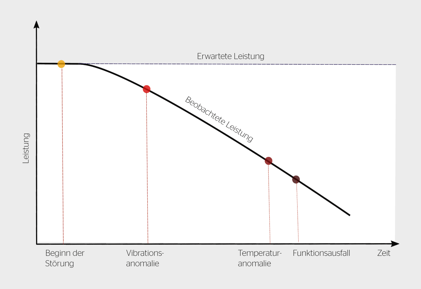 Bei einem breiten Spektrum von Systemen treten Funktionsstörungen nicht spontan auf, sondern entwickeln sich meist über einen Zeitraum hinweg. Dadurch werden sie frühzeitig detektierbar. Ein Leistungsabfall nimmt oft über die Zeit zu (Bild 1) und manifestiert sich dabei als Signalanomalie.[2] Diese Beobachtung bildet die Grundlage der vorausschauenden Wartung.