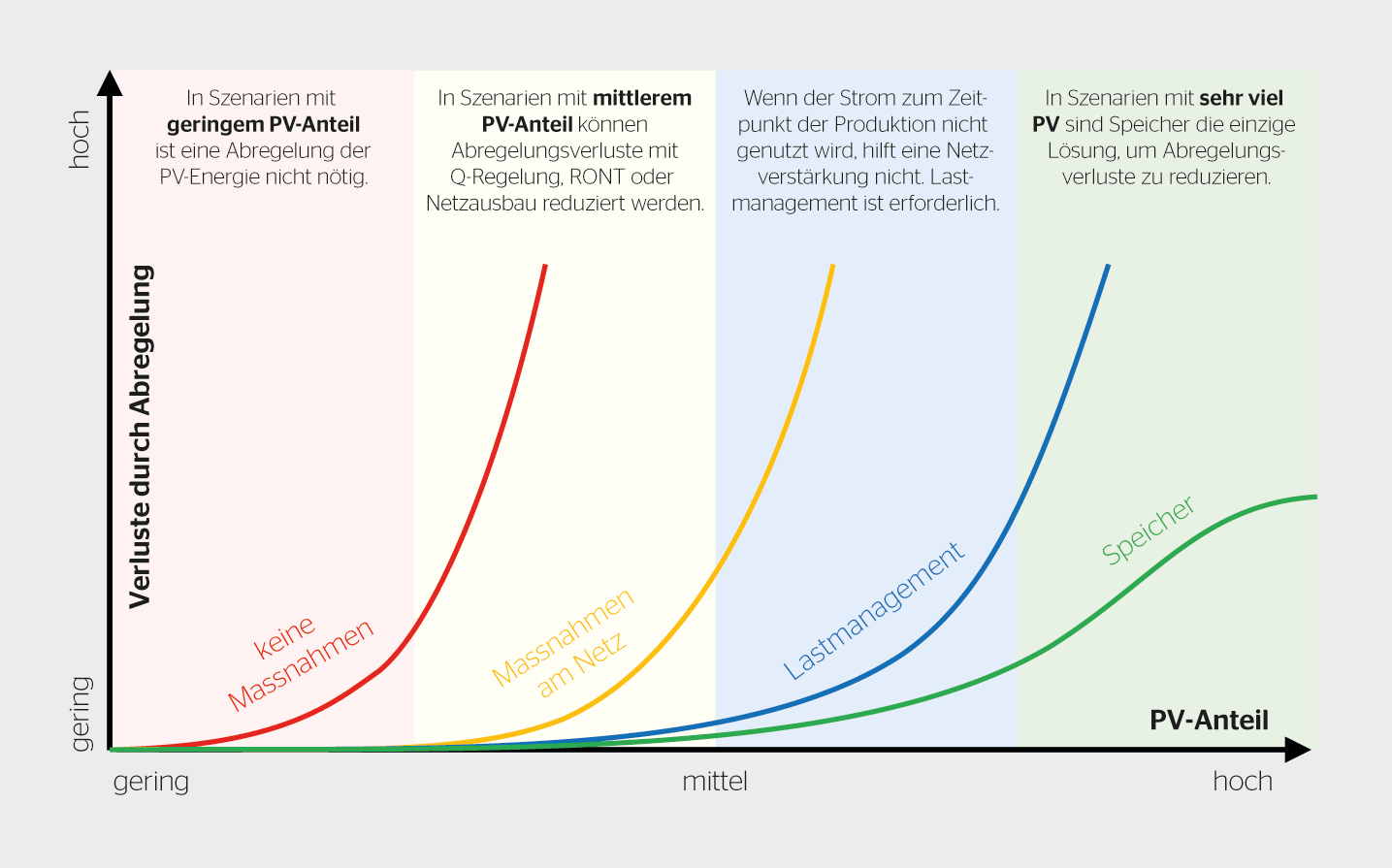 An sonnigen Stunden wird deshalb künftig nicht nur die Schweiz Solarstrom im Überfluss haben, sondern auch die Nachbarländer. Dies schmälert die Exportmöglichkeiten entsprechend. Falls doch exportiert werden kann, dann zu tiefen Preisen. Energietechnisch und volkswirtschaftlich scheint der Ausbau der Verteilnetze auf die volle potenzielle PV-Rückspeisung vor diesem Hintergrund wenig sinnvoll zu sein. Dies lässt sich natürlich nicht auf die Übertragungsnetze oder auf punktuelle Anschlussengpässe übertragen. Ohne entsprechenden Ausbau dieser Kapazitäten werden insbesondere im europäischen Kontext viele Anlagen nicht gebaut werden können.